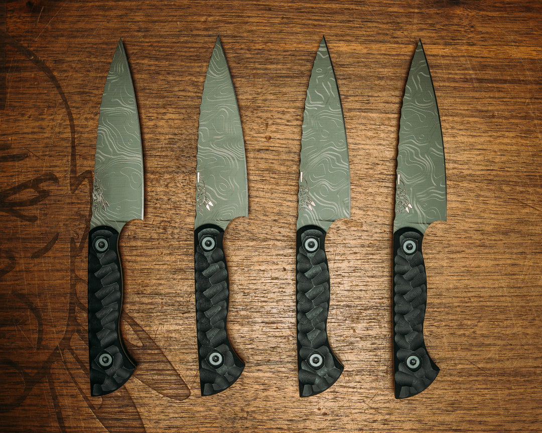 Steak Knife Set (4 piece)- Black G10, OD Green Topography Cerakote, Allen Bolts, Chaos Grip (Copy)