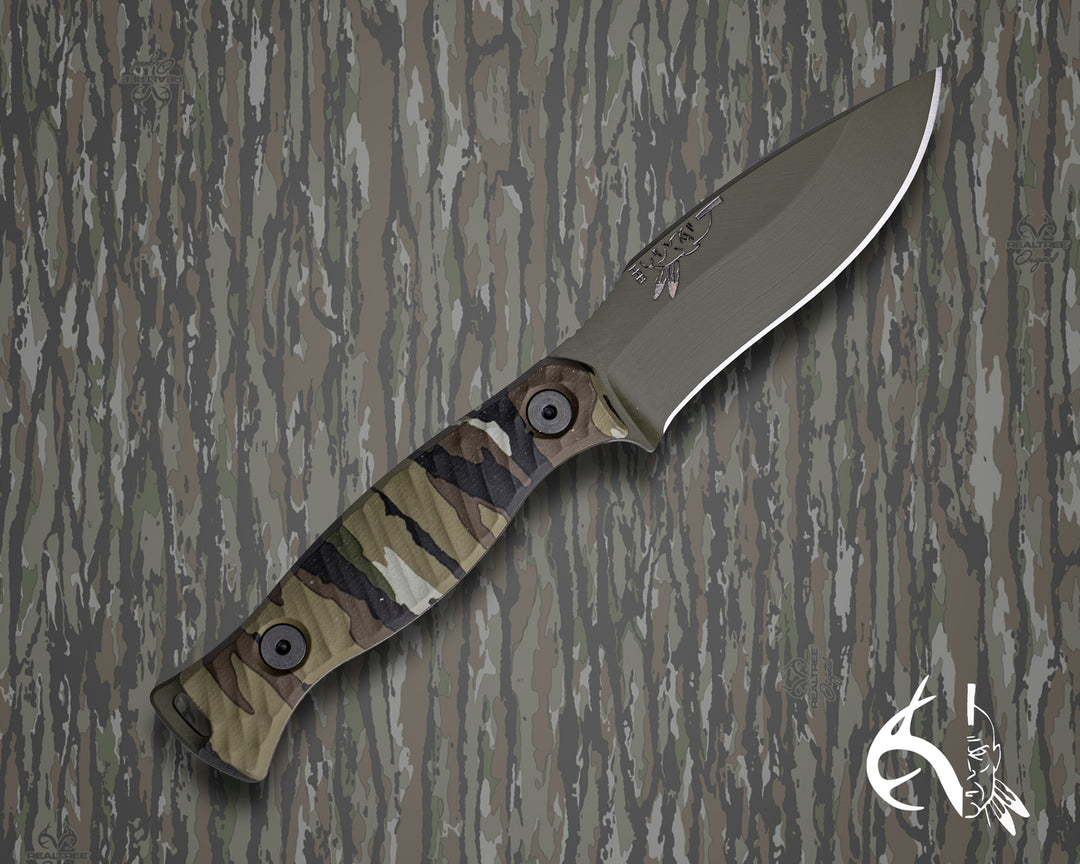 The 86' (HFB x Realtree) - Realtree Original Camo Hydro-dipped Micarta, Sniper Green Cerakote, Allen Bolts, Textured Grip.