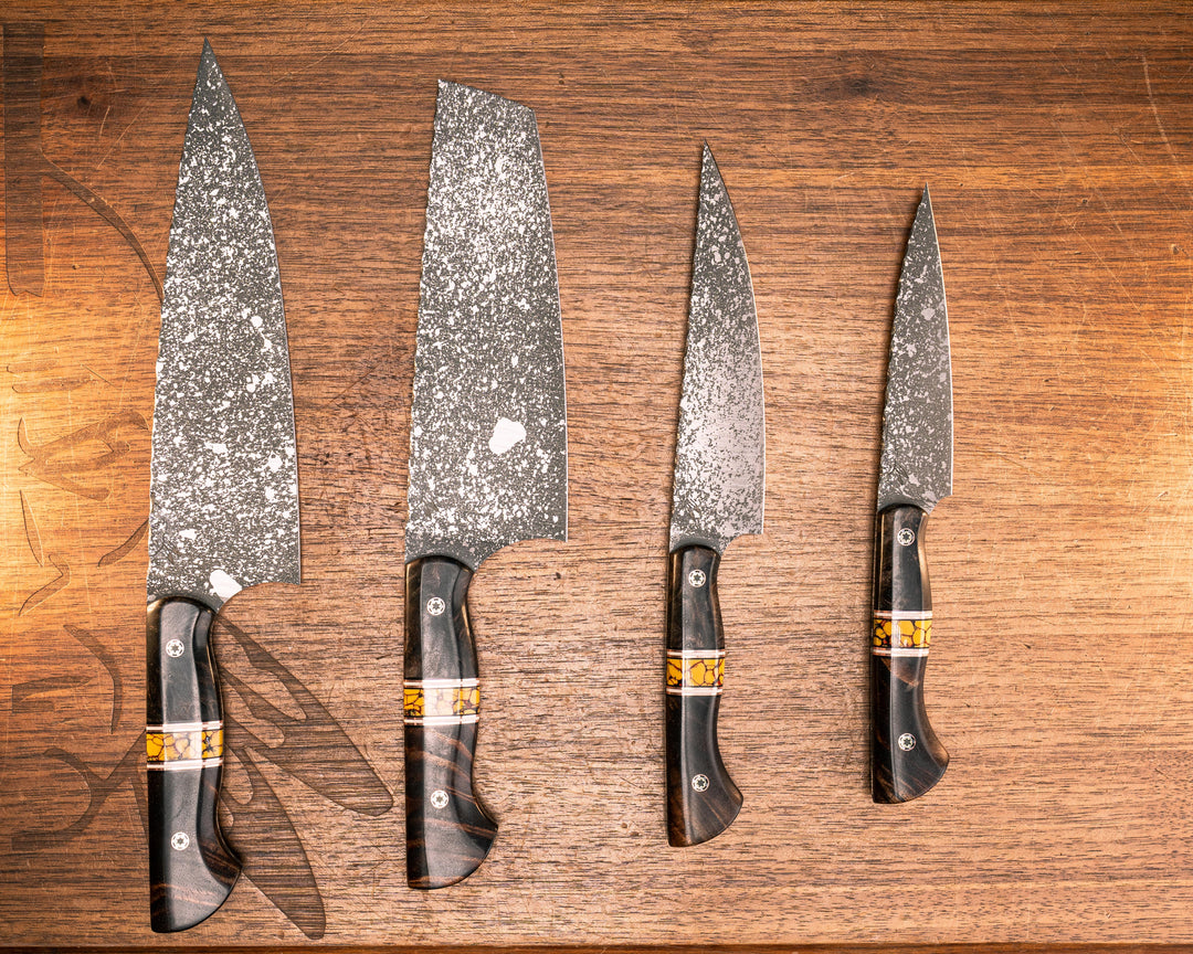Chef Set- Black G10, Black G10 and Brass Split, Gold Dark Matter Carbon, CF Pin, Brass Pin, Smooth Grip