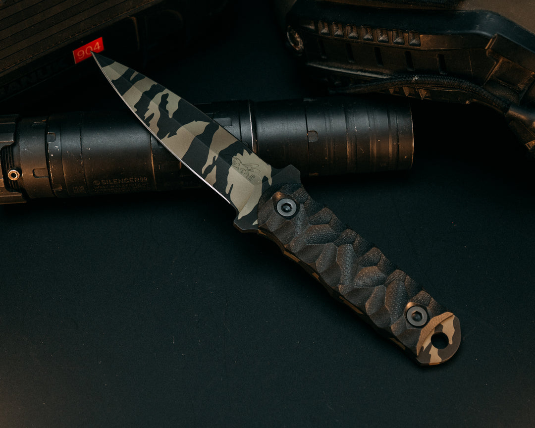 Combat Filet - Black G10, Tiger Stripe Multicam Cerakote, Allen Bolts, Chaos Grip