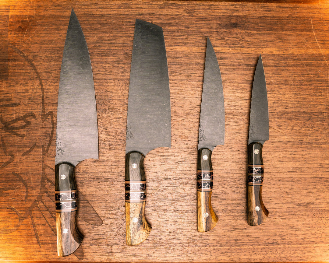 Chef Set- OD Green Canvas Micarta, Black G10 and Copper Pin Striping, Coyote G10, OD Green Canvas Micarta Pin Striping, Black with Copper Web Tru-stone Split, Pheasantwood. Mosaic Pins, Smooth Grip
