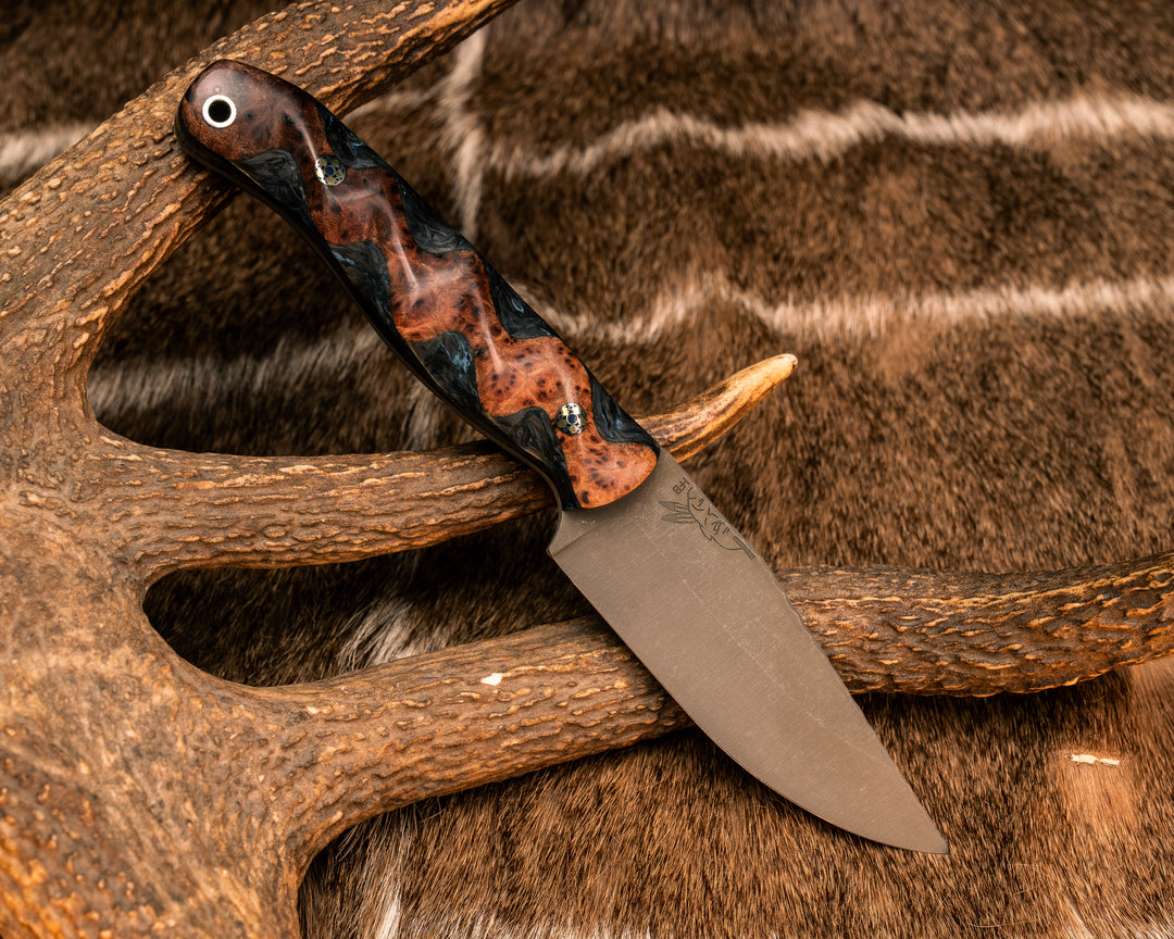 Crow Jr- Hawaiian Curly Koa, Black G10 and Copper Pin Striping, Blue Dark Matter Carbon, Copper Dark Matter Carbon and Green Dark Matter Carbon Split, Desert Ironwood, Copper Pins, Copper Lanyard Pin, Contoured Grip