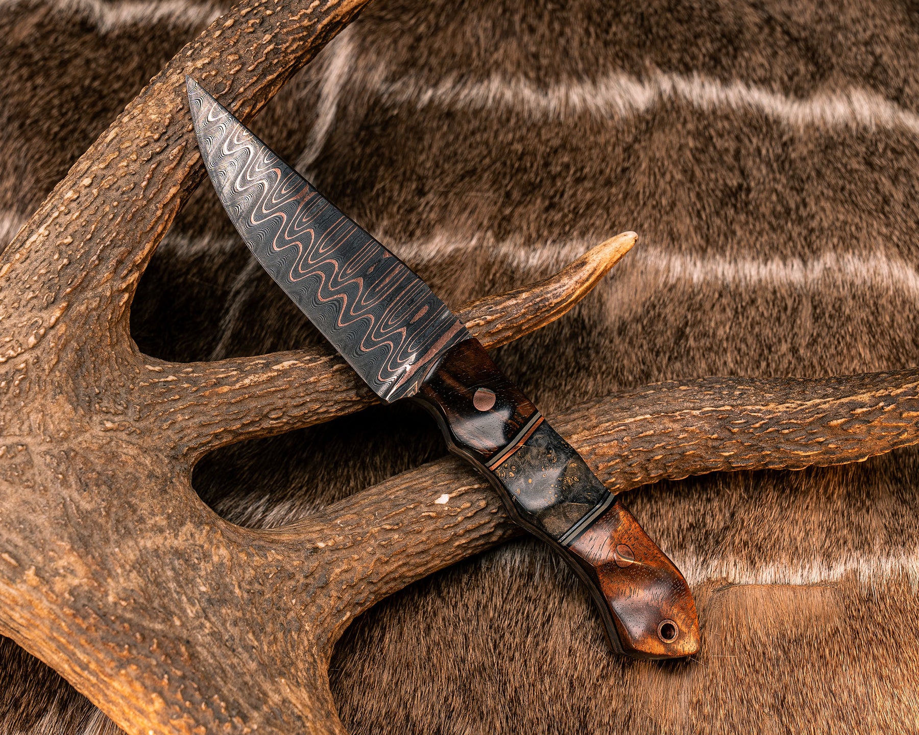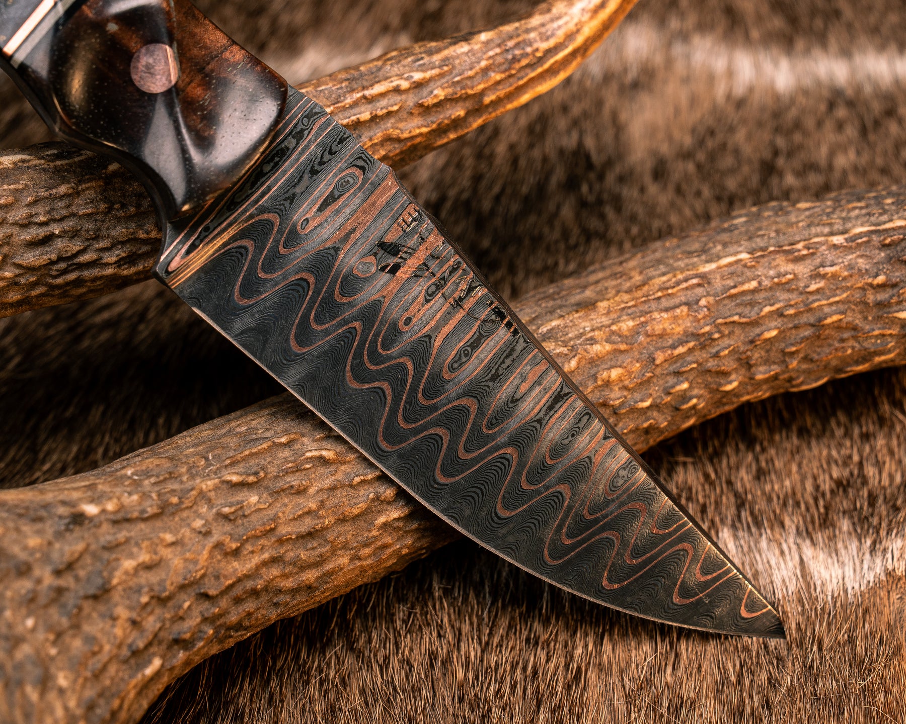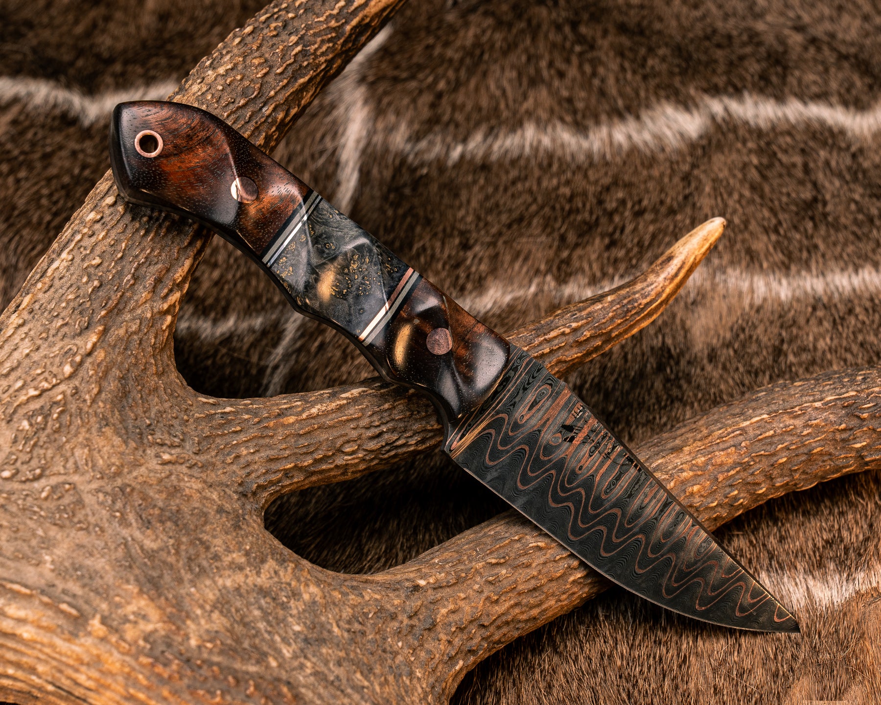 Red Crow- Baker Forge CopperMai Ladder Pattern Damascus- Hawaiian Curly Koa, Black G10, Grey G10 and Copper Pin Striping, Dyed Box Elder Split, Copper Pins, Copper Lanyard Pin, Textured Grip