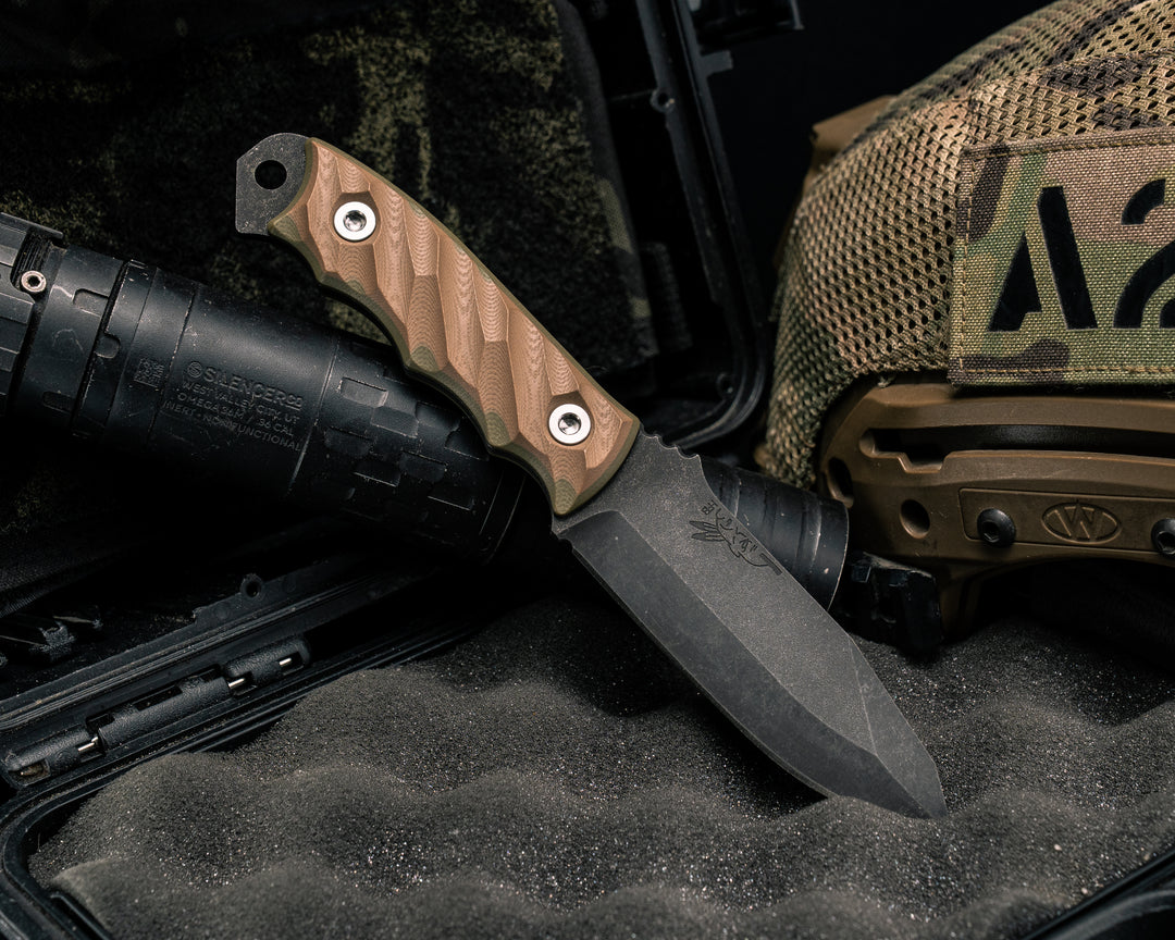 Tosahwi - Black Burlap Micarta, FDE Cerakote, Ti Allen Bolts, Iron Grip