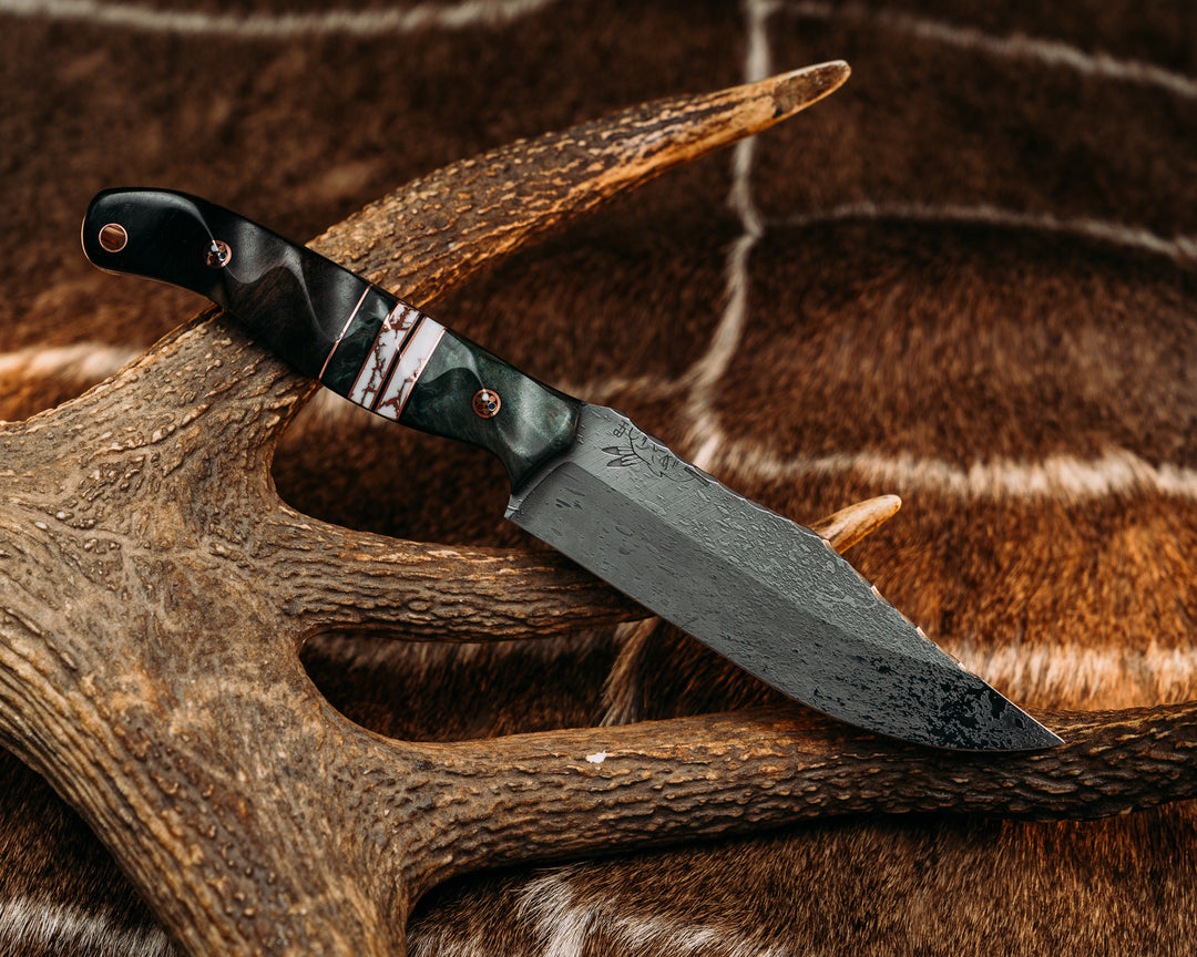 Crow Scout- Dyed Maple, Black G10 and Copper Pin Striping, White with Copper Web Tru-stone and Dyed Maple Split, Black and White Ebony, Patriot Mosaic Pins, Copper Lanyard Pin, Textured Grip