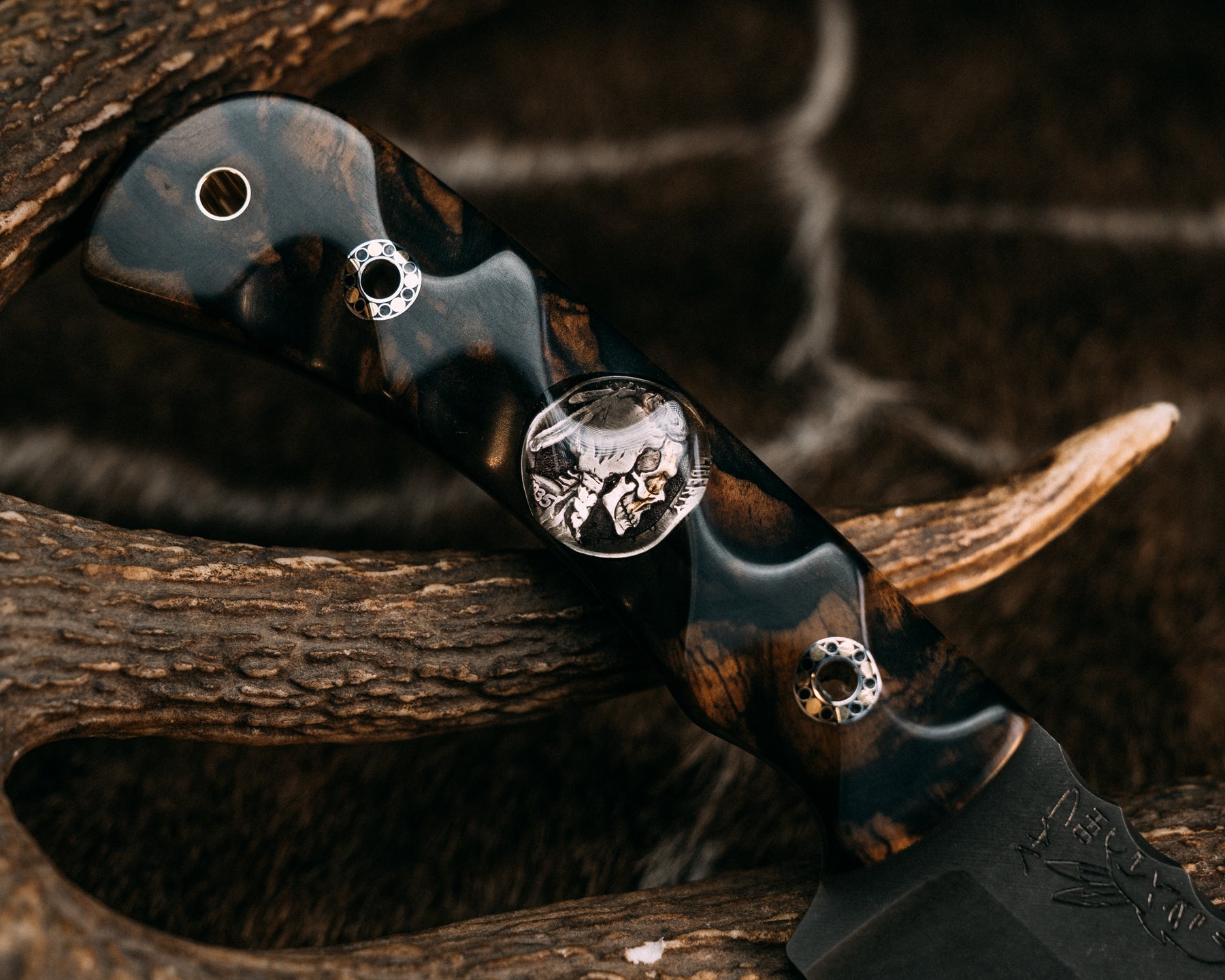 Cavner- Katalox, ATX Engraving 1935 "Well Loved" Warpaint Buffalo Nickel Inlay, Mosaic Hollow Pins, Brass Lanyard Pin, Textured Grip