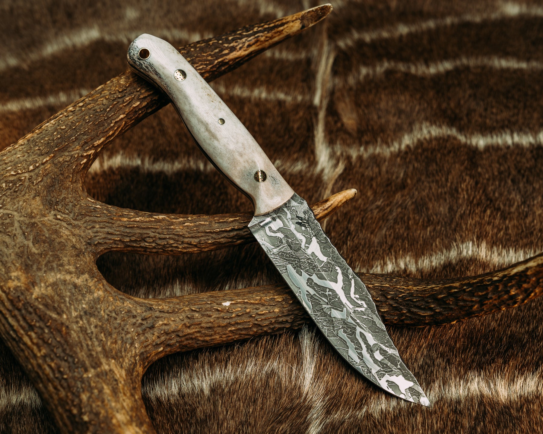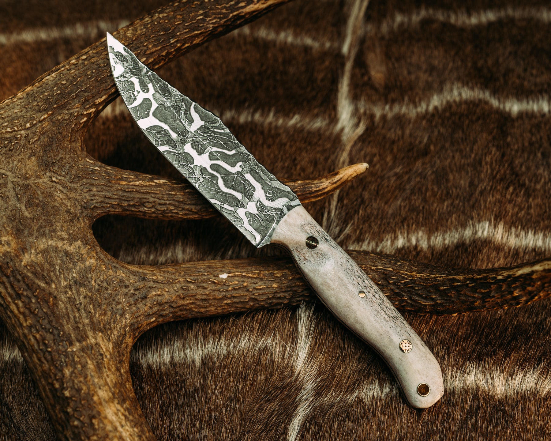 Next: Field Knife Drop Point - Black & Coyote G10 w/ Brass Pin Striping, Turquoise w/ Gold Web Tru Stone, Dyed Redwood, Patriot Mosaic Pins, Textured Grip.
