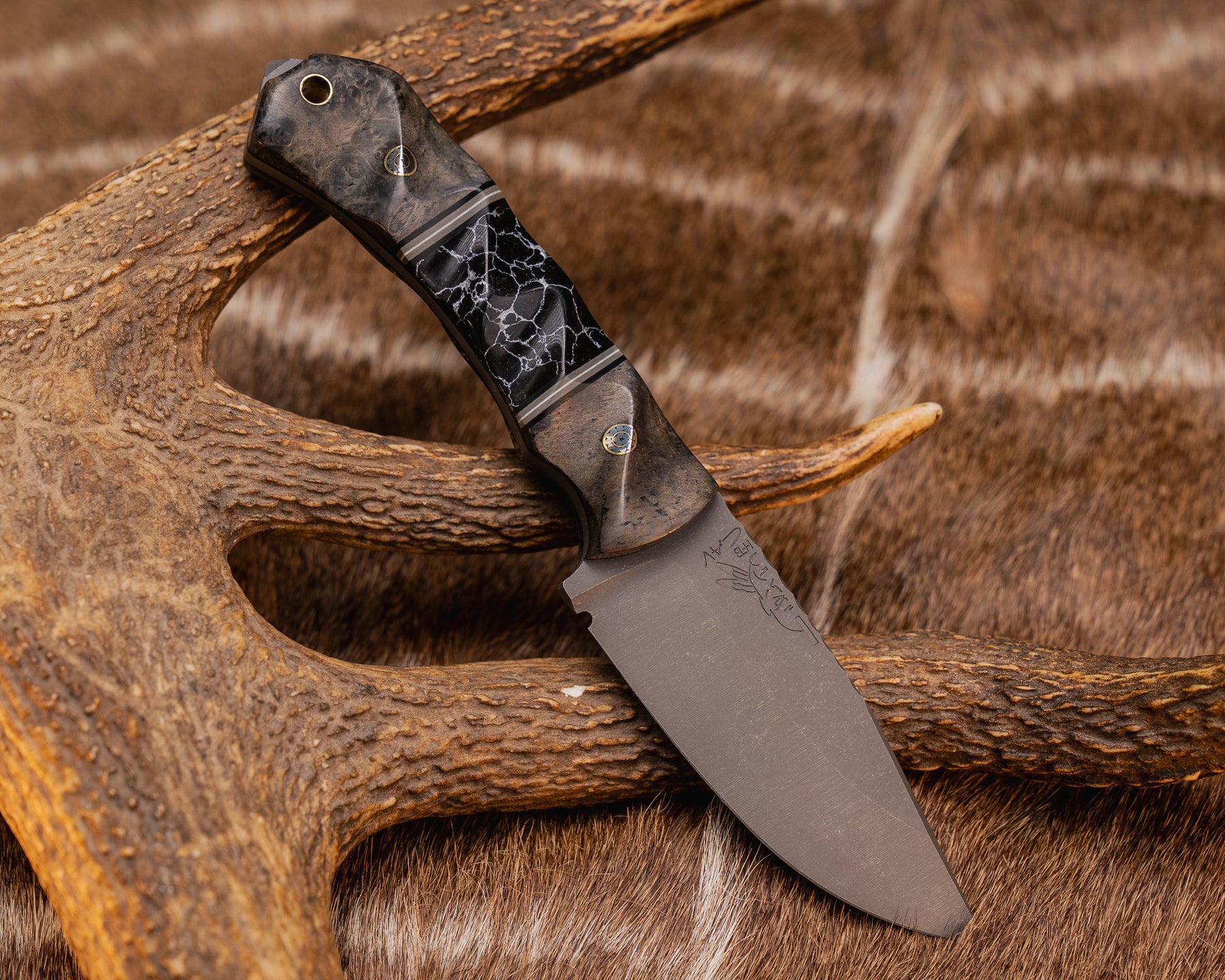 Modified Cavner- Dyed Maple, Black G10, Grey G10 and White G10 Pin Striping, Black with White Web Tru-stone Split, Mosaic Pins, Brass Lanyard Pin, Textured Grip
