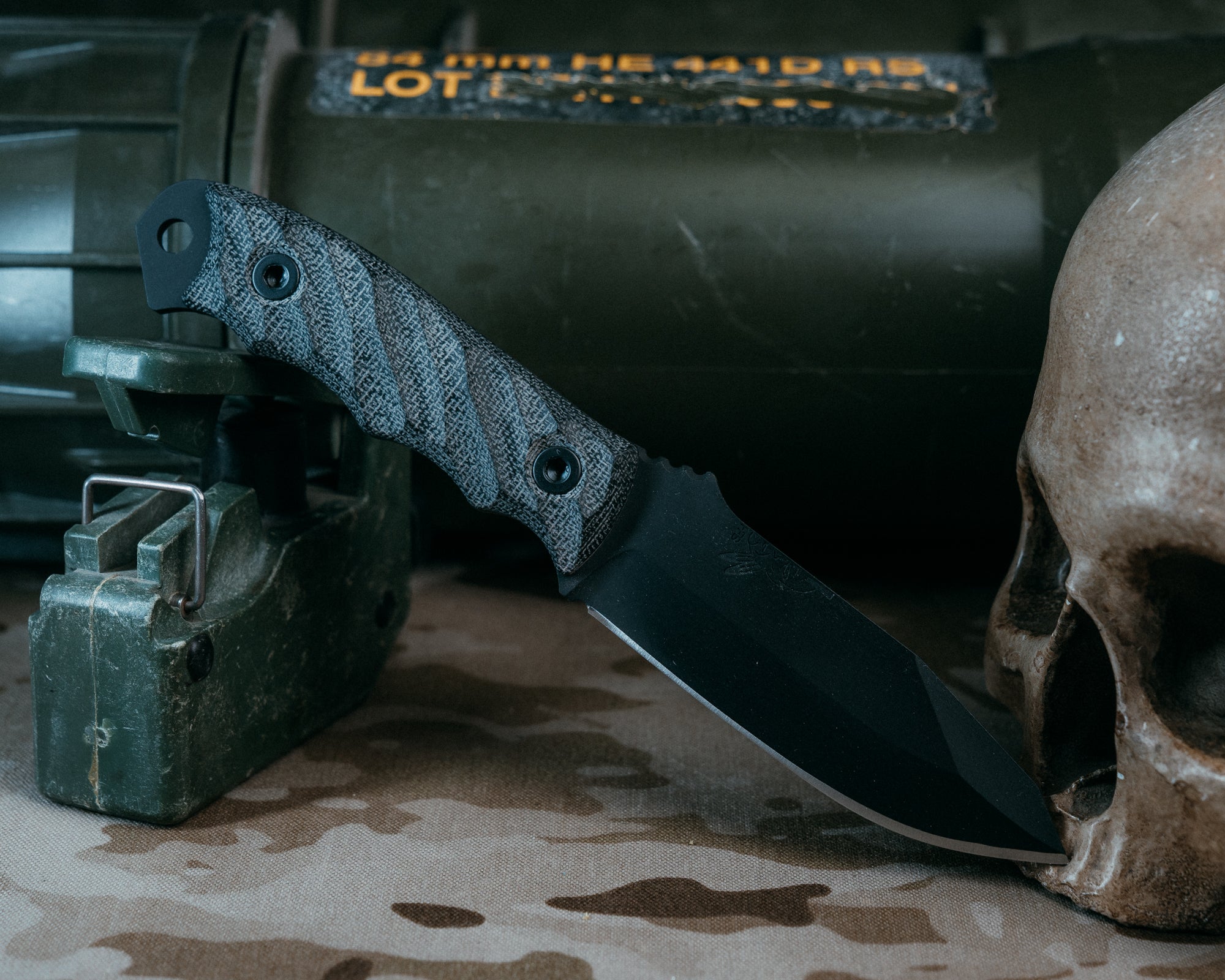 Blade designed by Special Operators for easy carry and easy access in plate carrier or in low vis situations, for pushing or stab and slash movements.