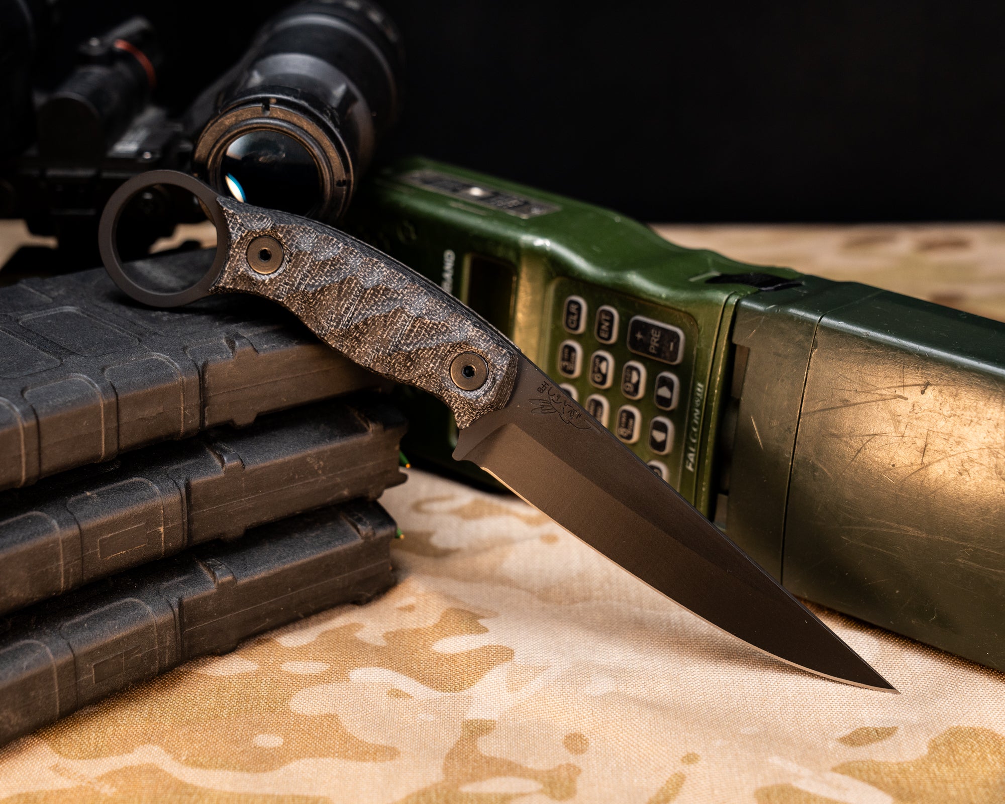 Skinner Jr- Black Burlap Micarta, Midnight Bronze Cerakote, Allen Bolt