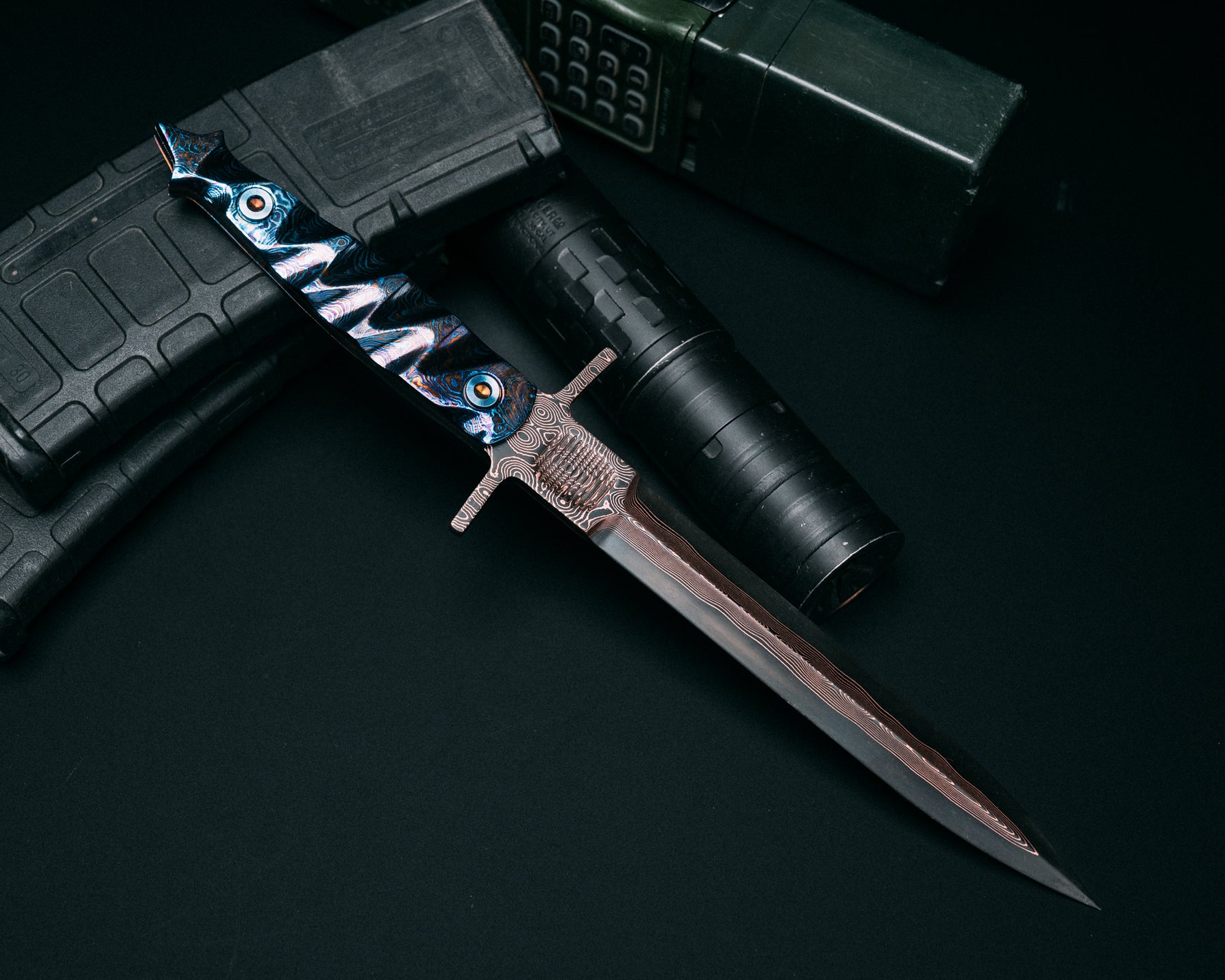 V-42 Dagger- Baker Forge Raindrop CopperMai- Black Kraken Timascus Handle, Allen Bolts, Textured Grip