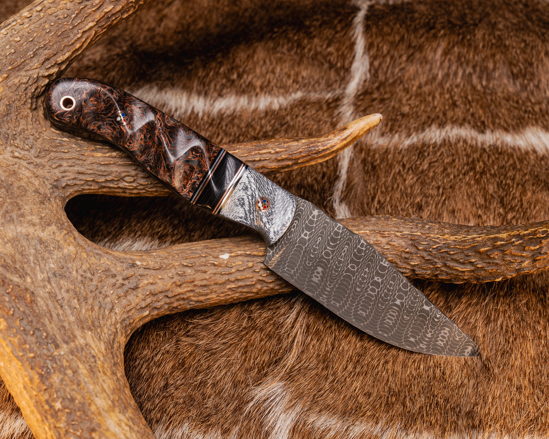 Crow Scout Tanto- Baker Forge Raindrop Pattern Damascus- Walnut, Black G10 and Copper Pin Striping, Bison Horn Split, CO Elk Antler, Copper Pins, Copper Lanyard Pin, Textured Grip