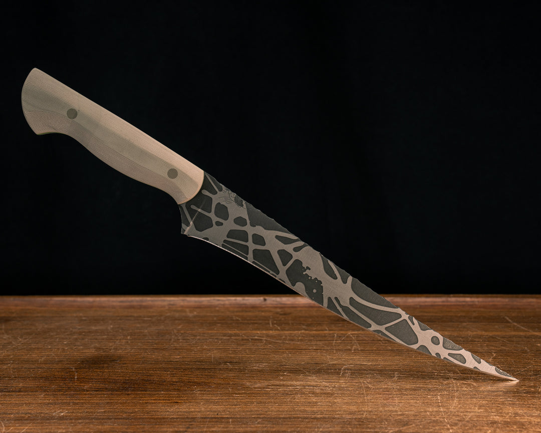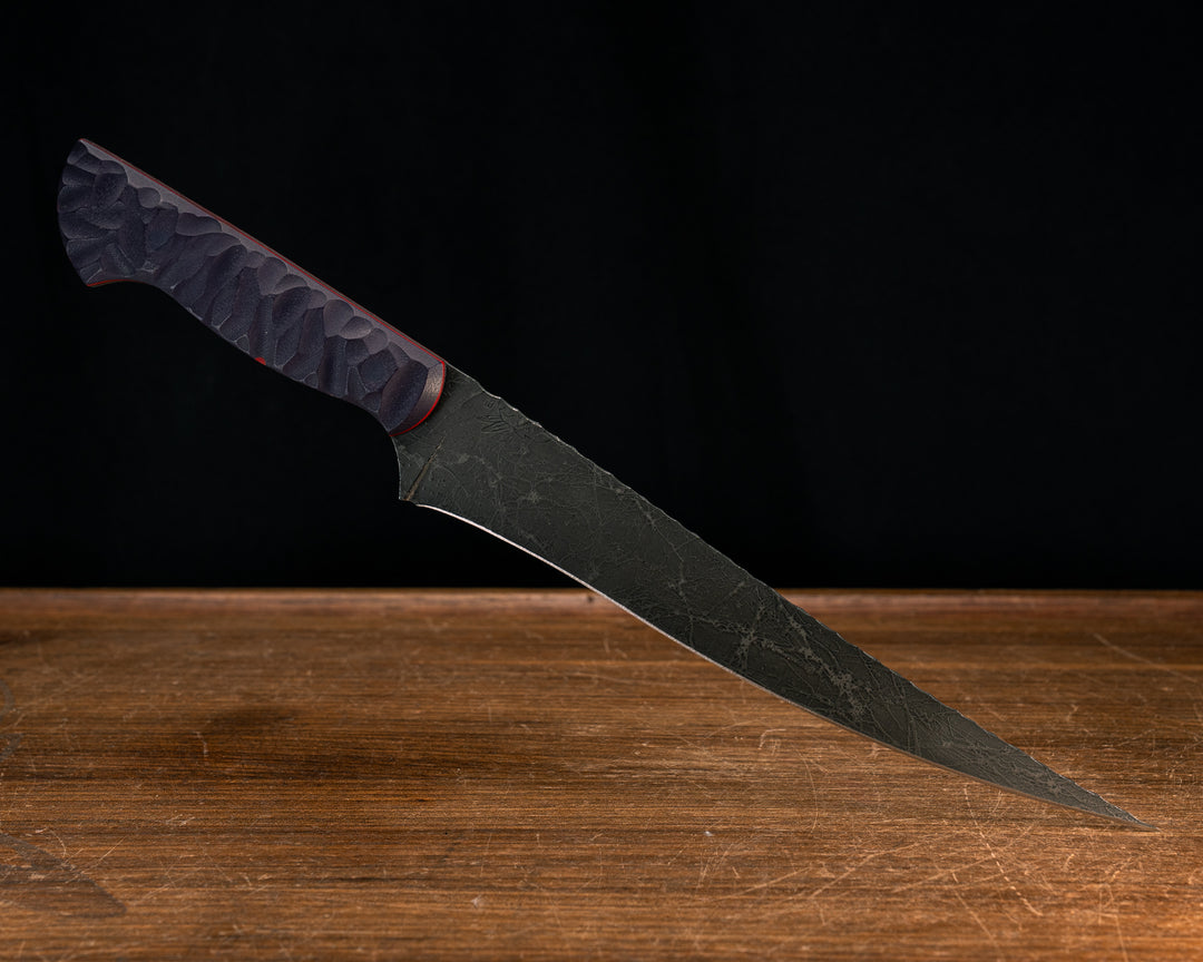 Chef Blade- Ancient Bog Oak, Black G10 and Copper Pin Striping, Black with Copper Web Tru-stone Split, Dyed Maple, CF Pins, Smooth Grip