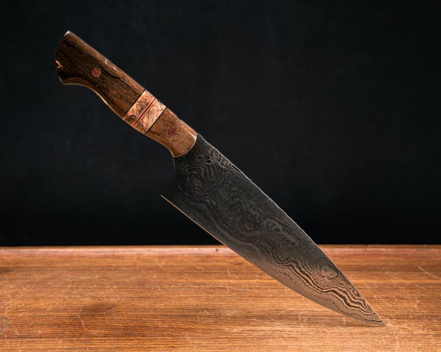 10" Chef Blade - Redwood, Black G10 & Copper Pin Striping, Black w/ Copper Matrix Tru Stone Split, Ambulu, Mosaic Pins, Smooth Grip.
