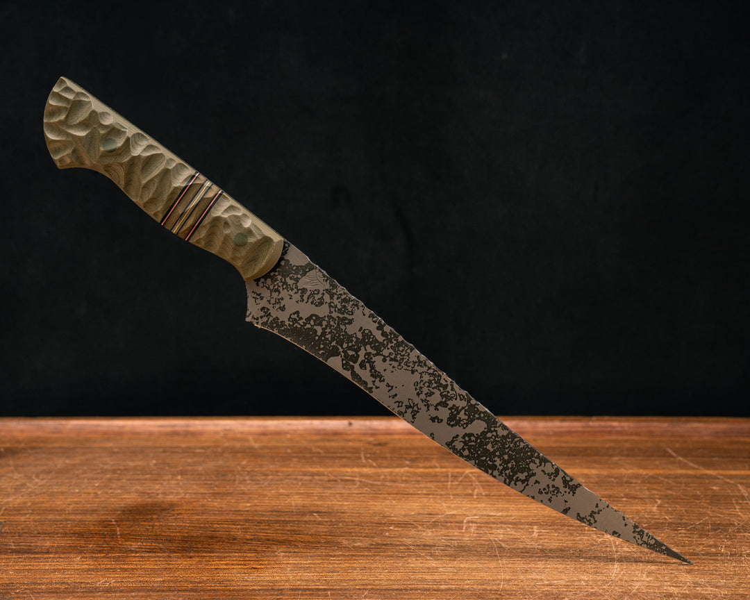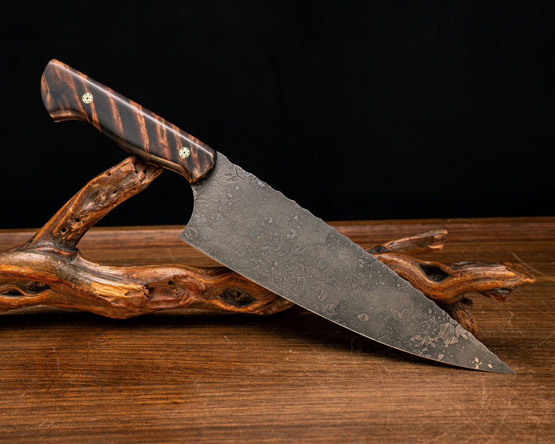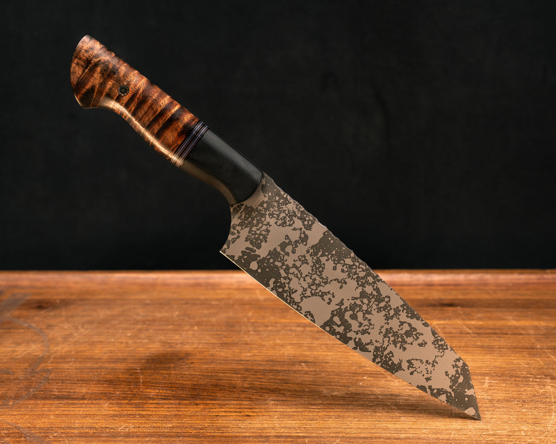 10" Chef Blade- Spalted Maple, Black G10 and Copper Pin Striping, Desert Ironwood Split, CF Pins, Smooth Grip