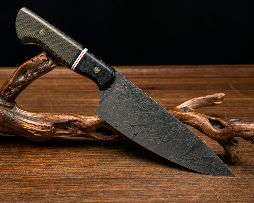 Chef Blade- Black Burlap Micarta, Black G10, OD Green G10, Copper and Black Canvas Micarta Split, Maple, Mosaic Pins, Smooth Grip