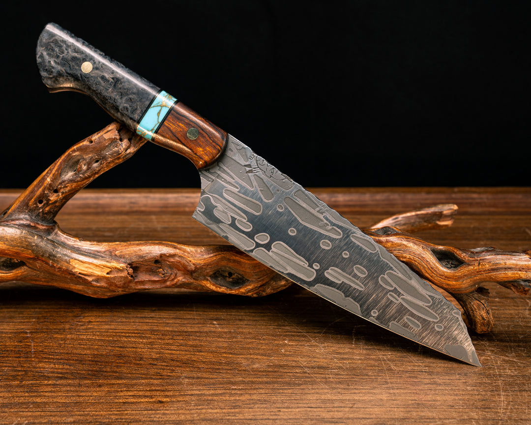 Chef Blade 10"- Amboyna Burl, Black G10, Copper and White G10 Pin Striping, Turquoise with Black Matrix Tru-stone Split, Patriot Mosaic Pins, Smooth Grip
