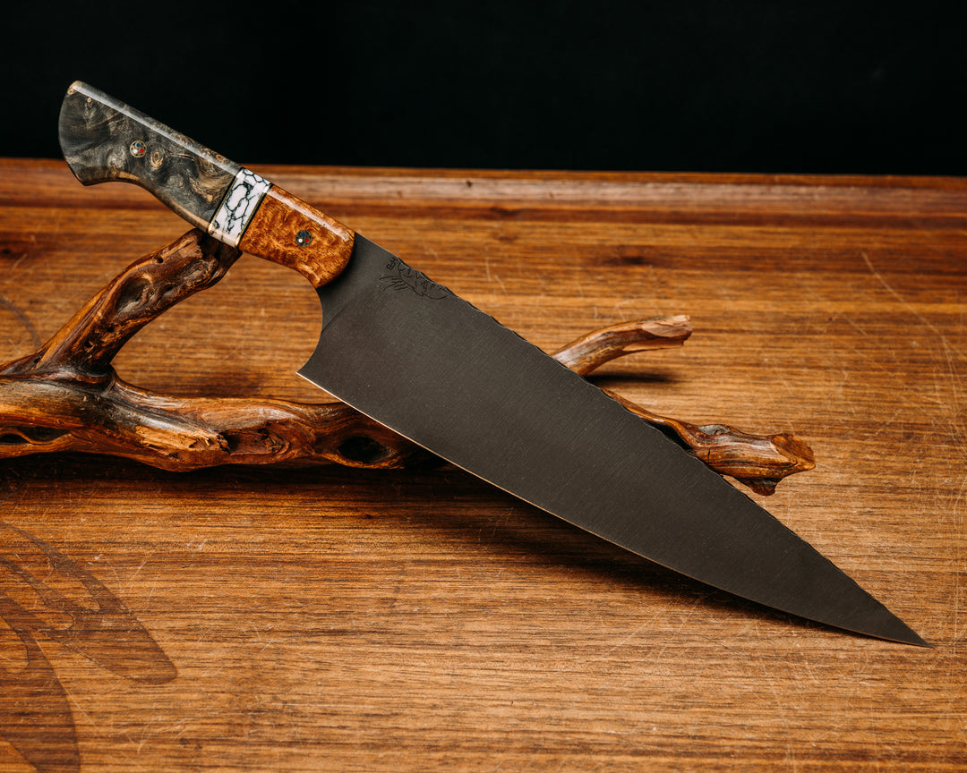 10" Chef Blade- Afzelia Burl, Black G10 and Brass Pin Striping, White Turquoise Tru-stone Split, Buckeye Burl, Patriot Mosaic Pins, Smooth Grip