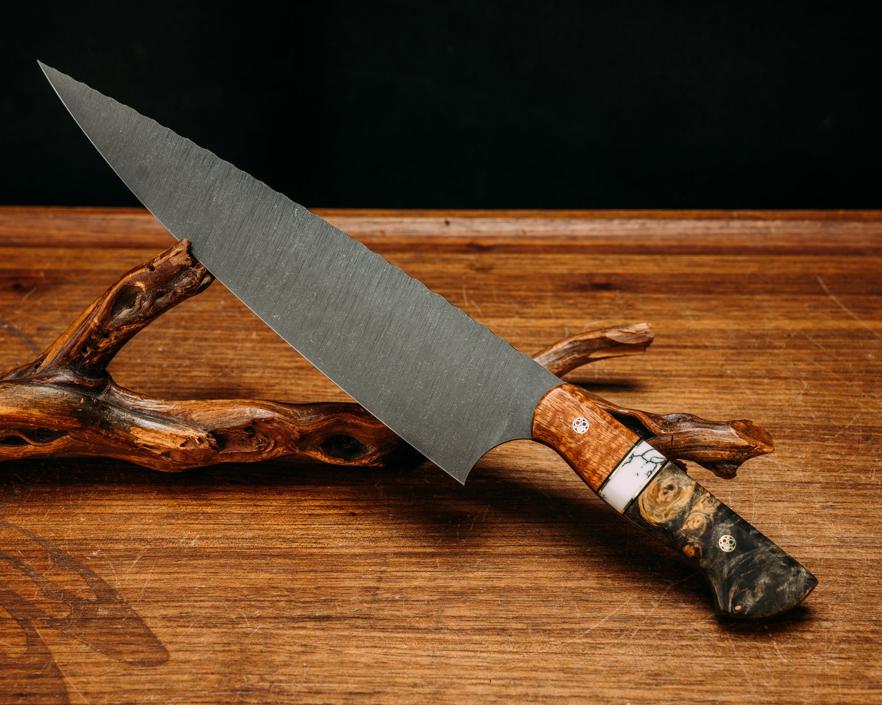 10" Chef Blade- Afzelia Burl, Black G10 and Brass Pin Striping, White Turquoise Tru-stone Split, Buckeye Burl, Patriot Mosaic Pins, Smooth Grip