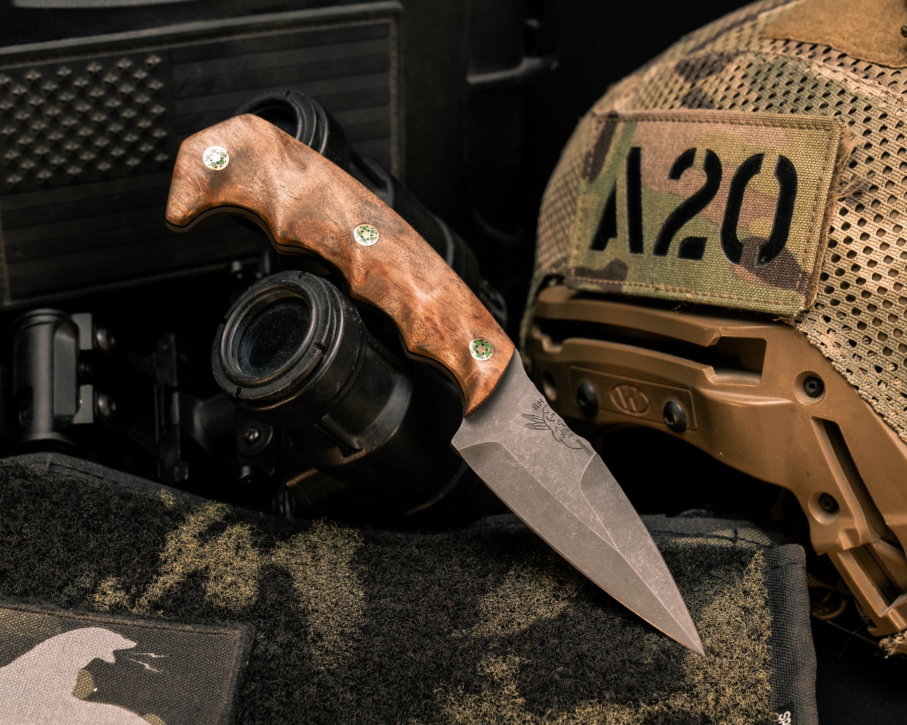 Next: Disaster Cub- Amboyna Burl, White G10, Natural Canvas Micarta and Copper Split, Black Ash Burl, Patriot Mosaic Pins, Copper Pin, Textured Grip