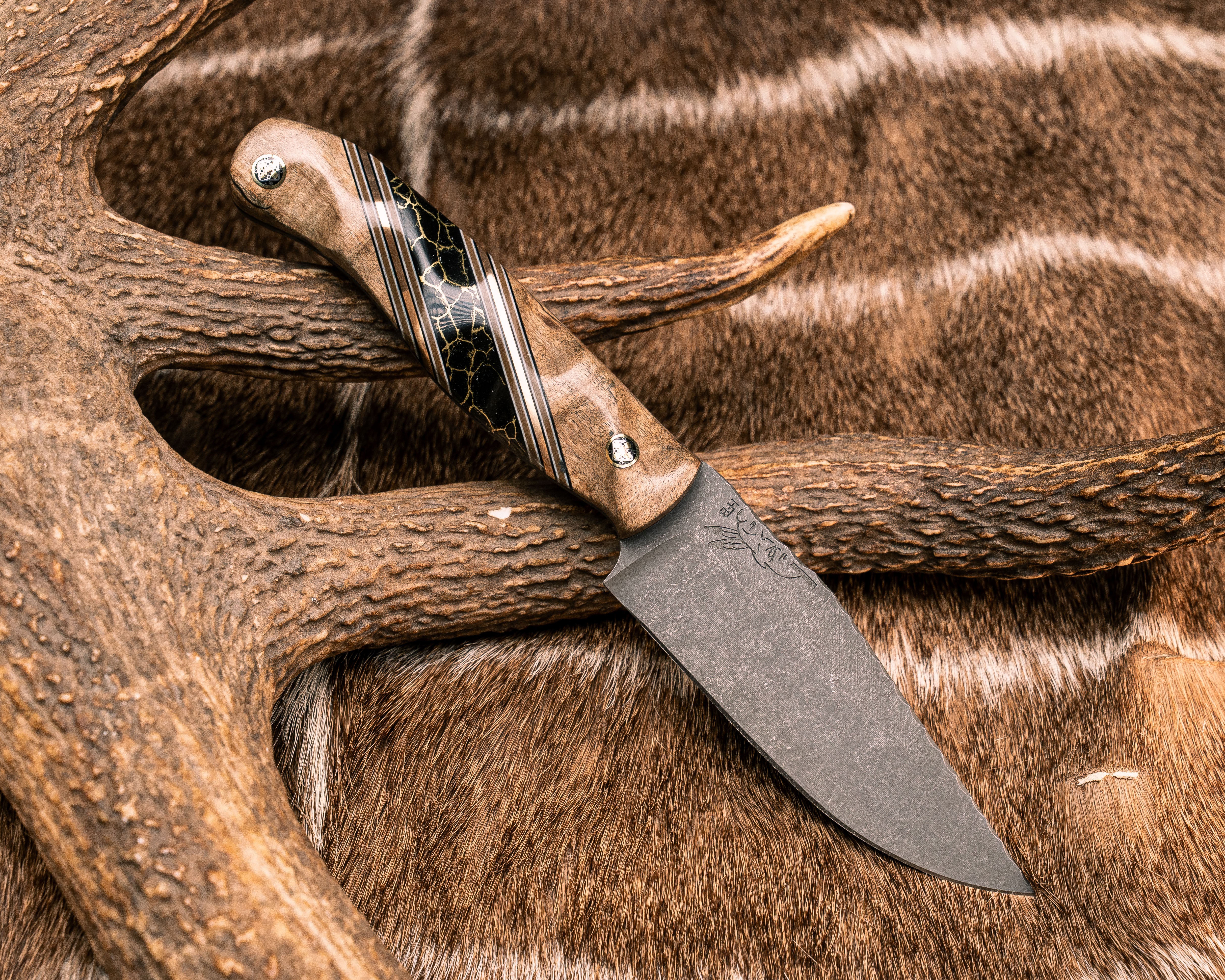Next: Crow Scalper- Spalted Curly Maple, Black G10, White G10, Coyote G10 and Bronze Pin Striping, Black with Gold Web Tru-stone Split, Mosaic Pins, Textured Grip