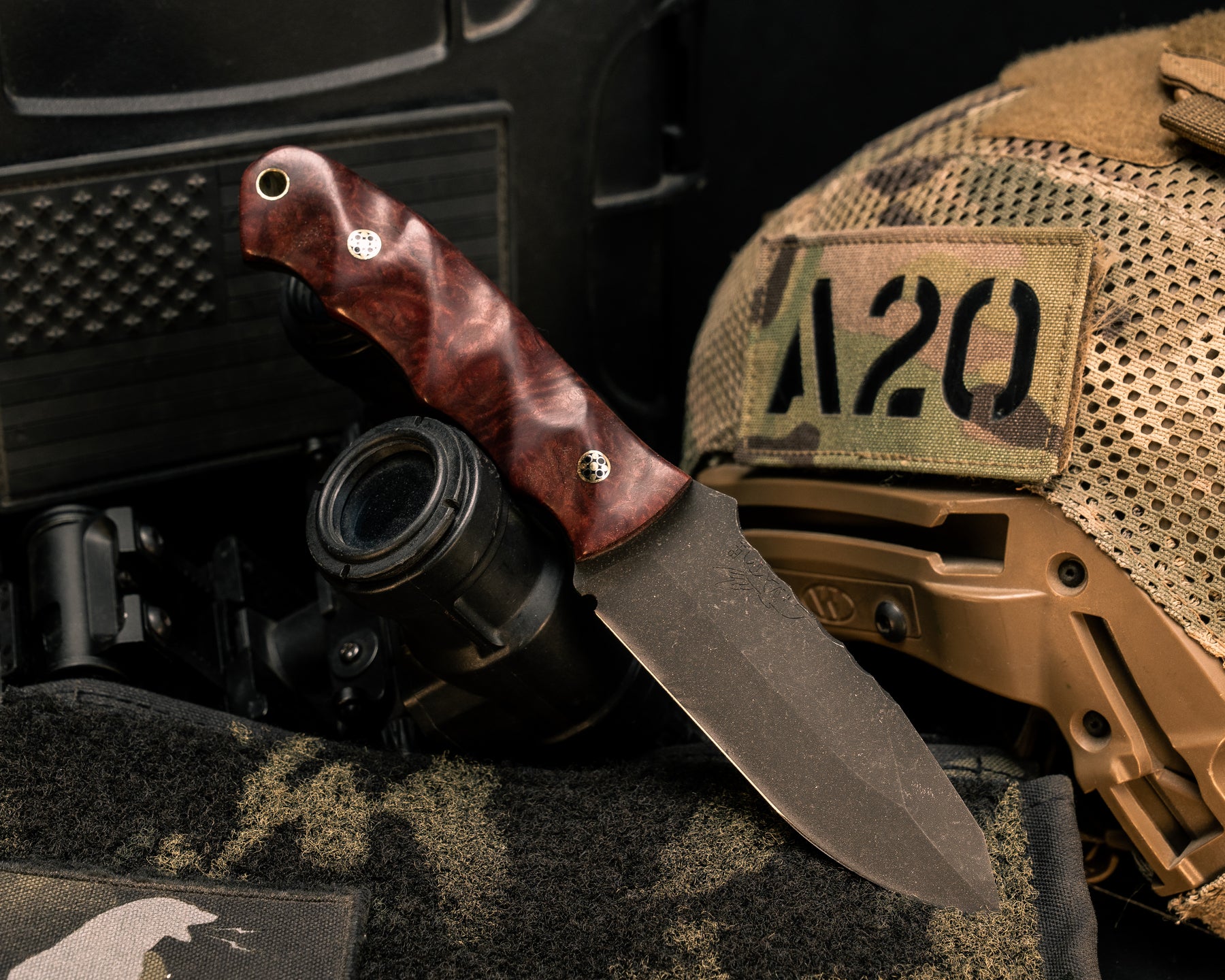 Next: Disaster Jr- Desert Ironwood, Brass and Black G10 Pin Striping, OD Green Canvas Micarta and Dyed Giraffe Bone Split, Brass Pins, Textured Grip