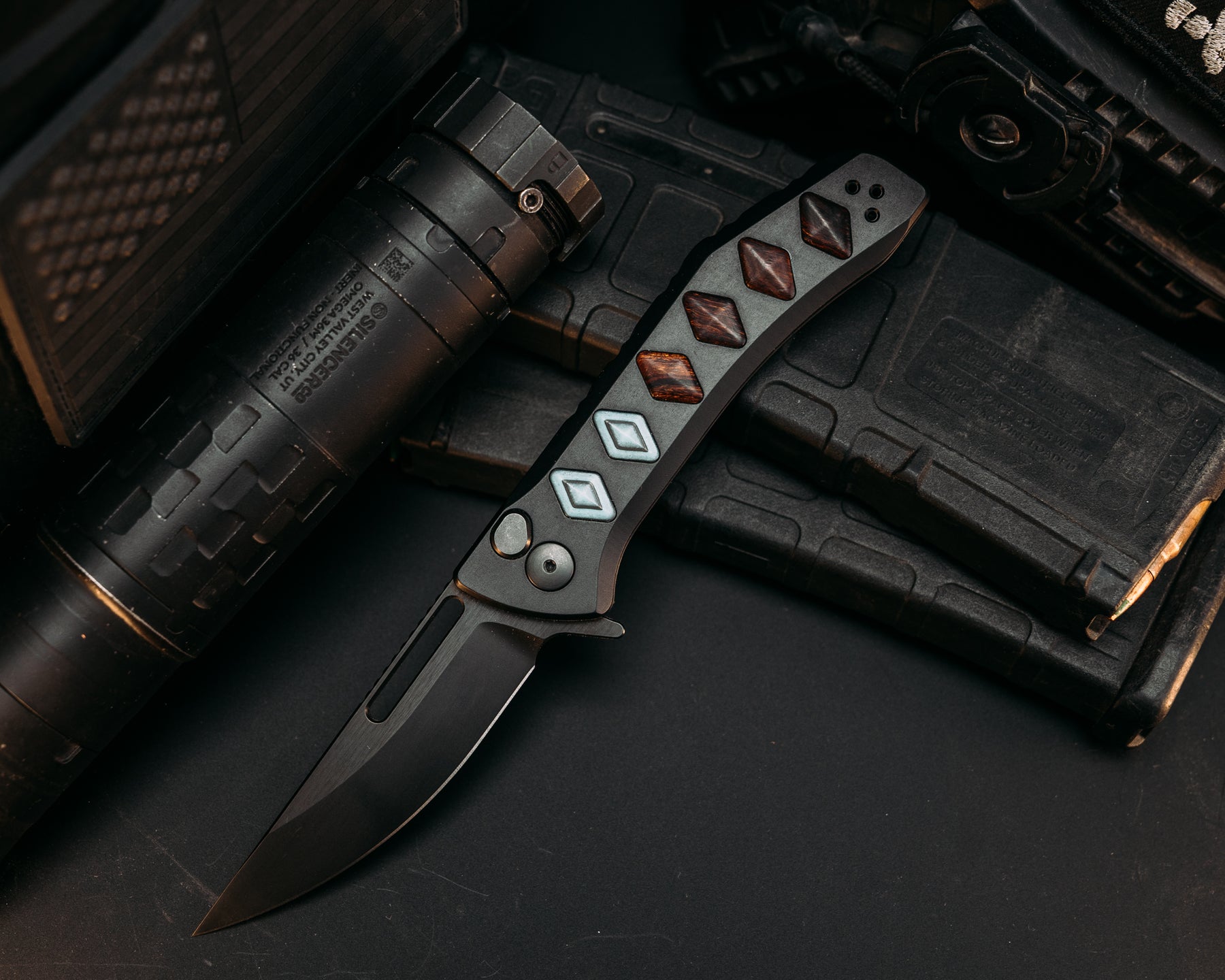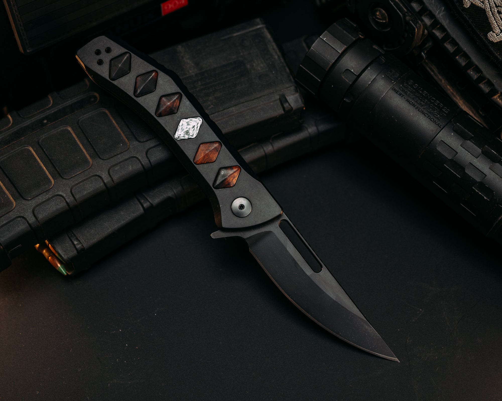Custom Kwaiken Folder - Brittany Camo Quartz & Desert ironwood Inlay, Anodized Black Handle, Black Nitride Blade, Textured Grip, Deep Carry Pocket Clip