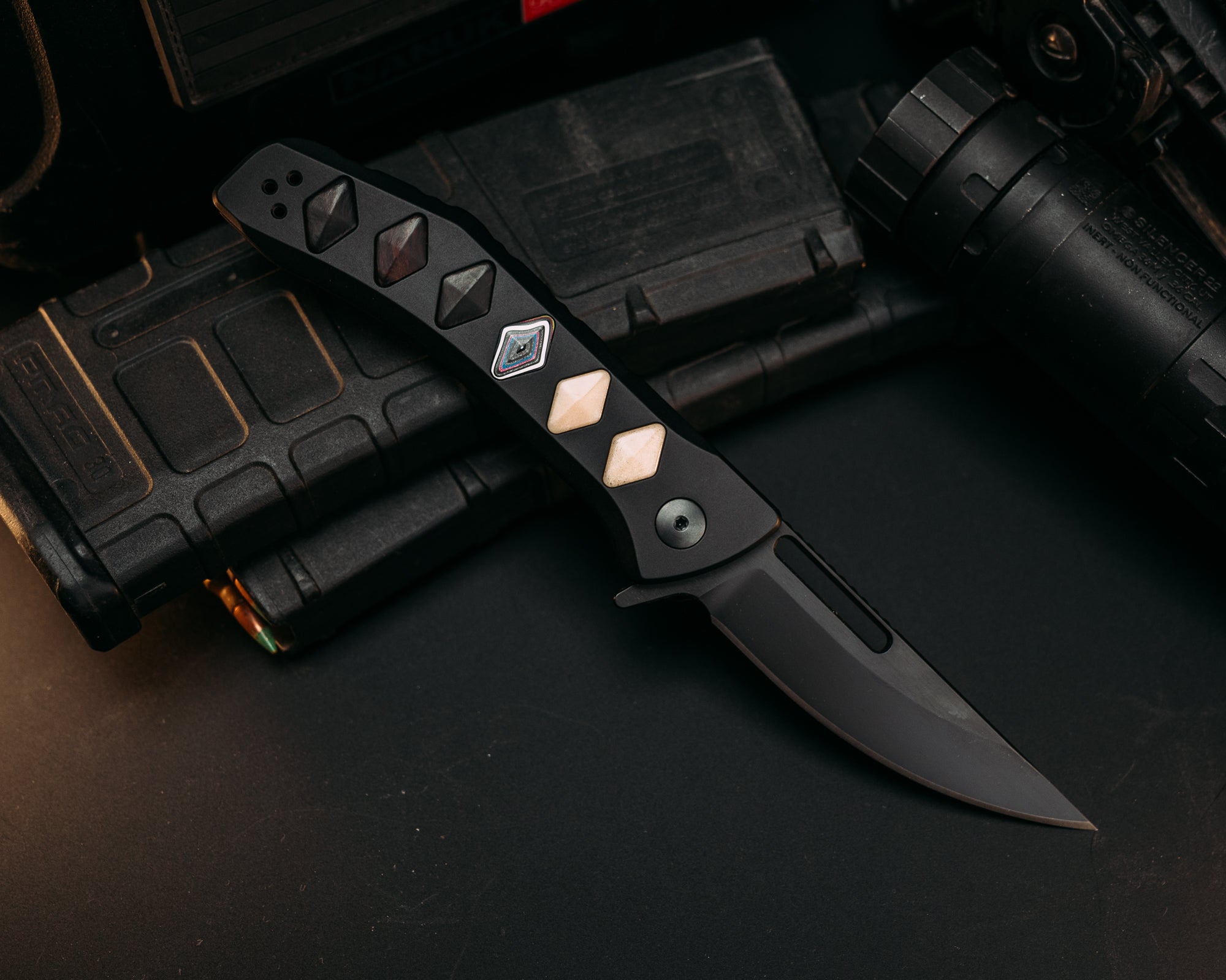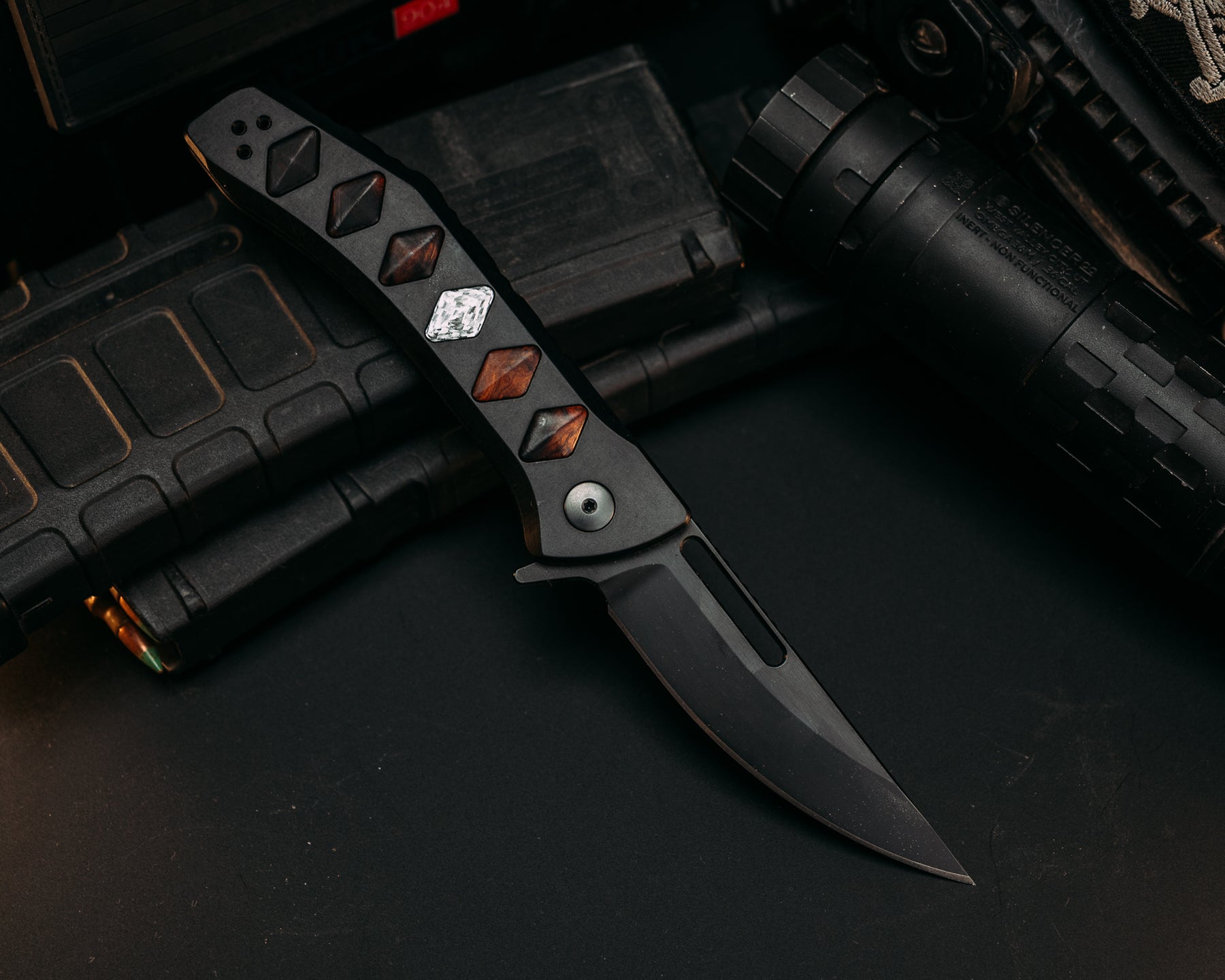 Custom Kwaiken Folder - Desert Ironwood & Silver Carbon Fiber Inlay, Anodized Black Handle, Black Nitride Blade, Textured Grip, Deep Carry Pocket Clip