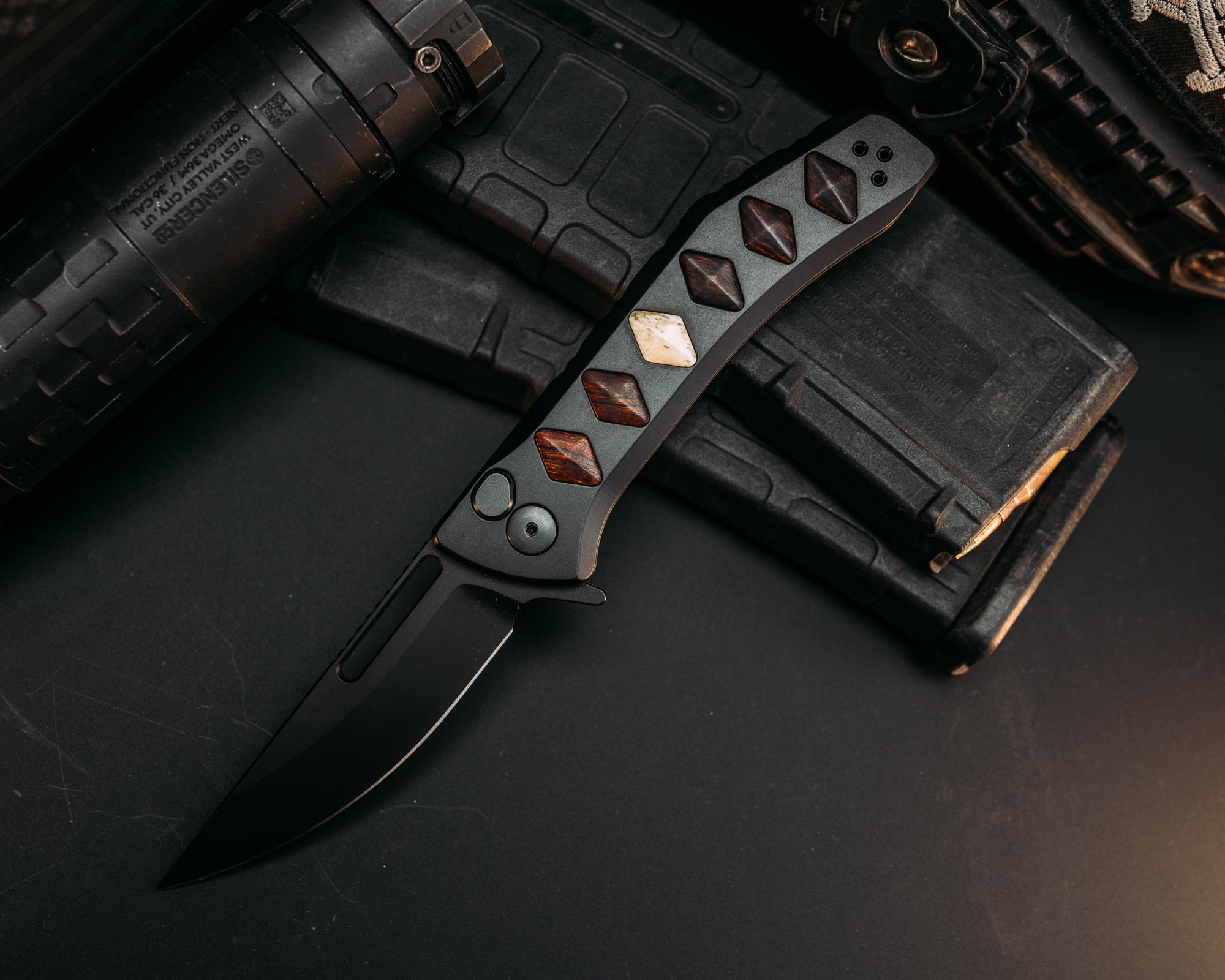 Custom Kwaiken Folder - Spalted Maple & Red Camo Quartz Inlay, Anodized Black Handle, Black Nitride Blade, Textured Grip, Deep Carry Pocket Clip