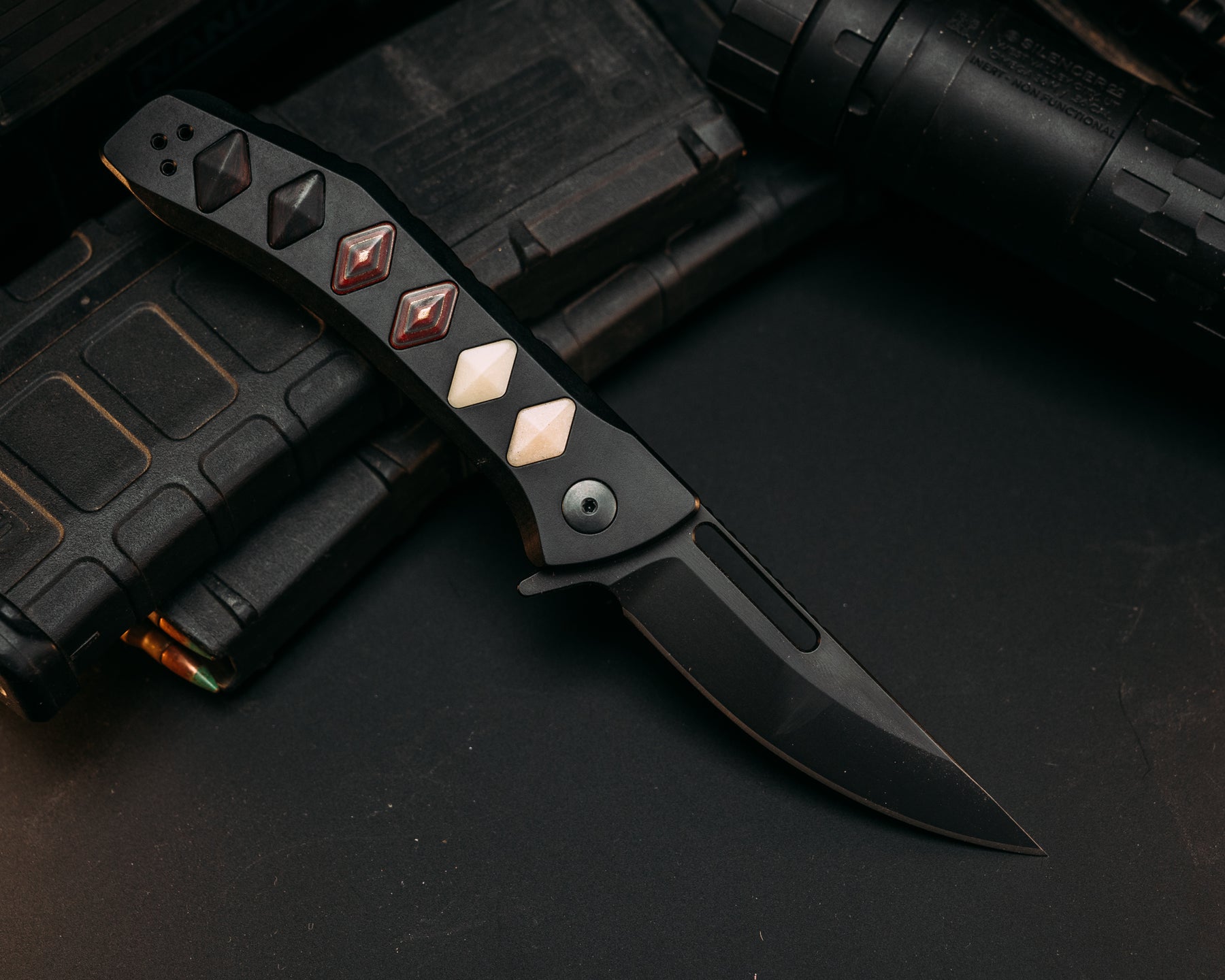 Custom Kwaiken Folder - Vintage Westing House Paper Micarta, Red Camo Quartz & Desert Ironwood Inlay, Anodized Black Handle, Black Nitride Blade, Textured Grip, Deep Carry Pocket Clip