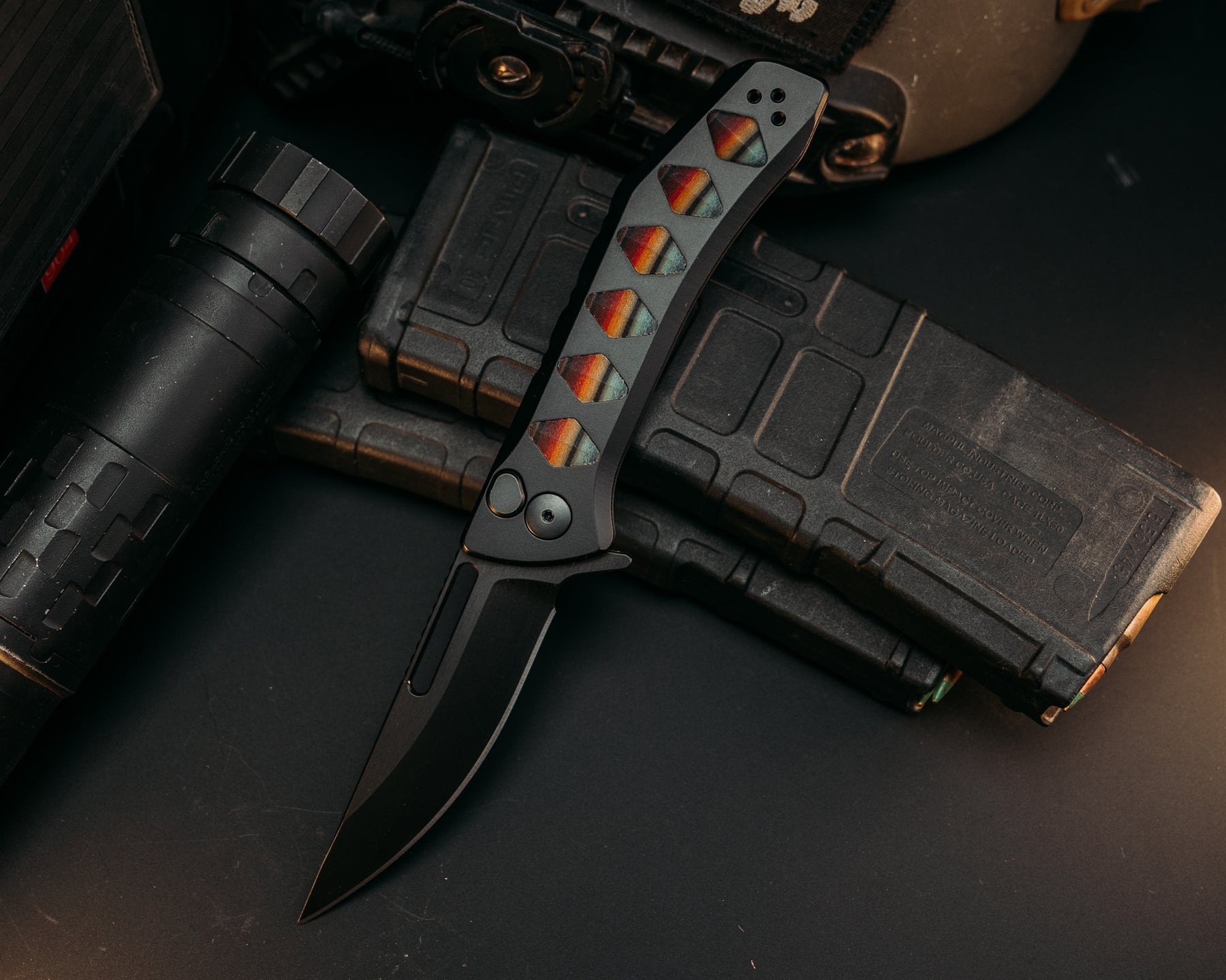 Custom Kwaiken Folder - Mexican Blanket G-Carta Inlay, Anodized Black Handle, Black Nitride Blade, Textured Grip, Deep Carry Pocket Clip