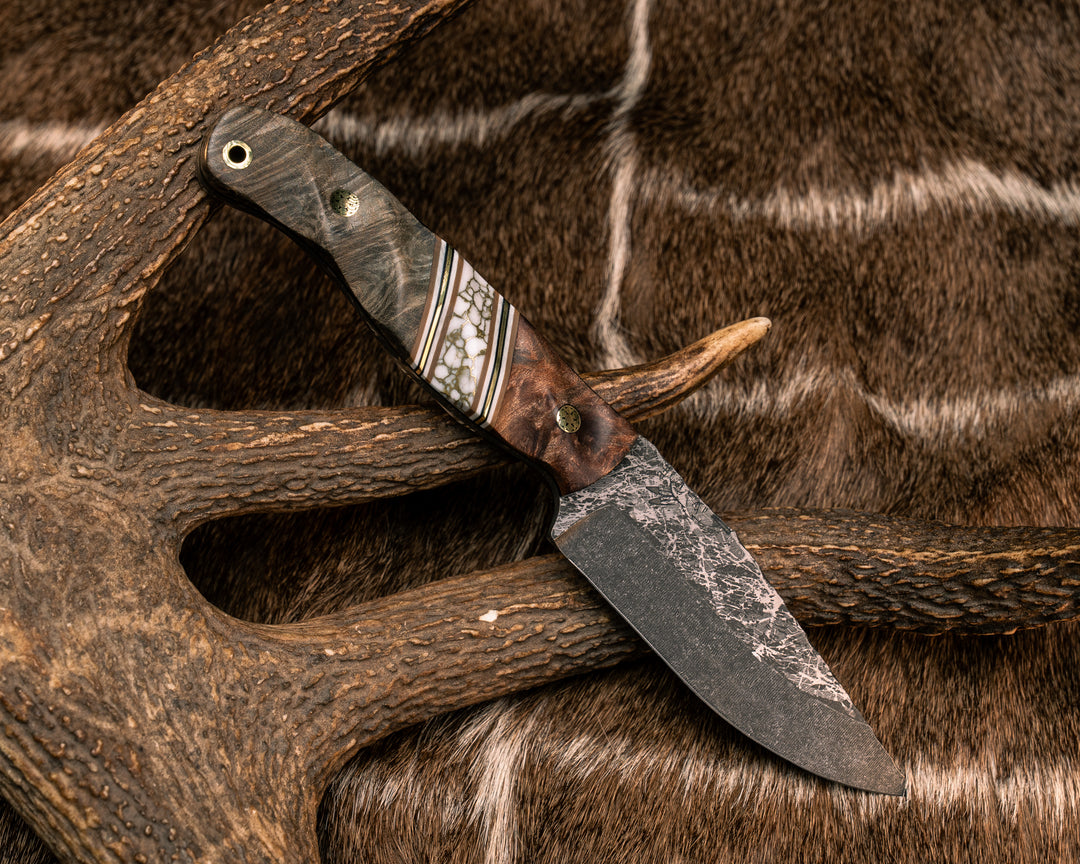 Crow Jr- Redwood Burl, Coyote G10, White G10, Black G10 and Brass Pin Striping, White with Gold Web Tru-stone Split, Dyed Maple, Mosaic Pins, Brass Lanyard Pin, Textured Grip