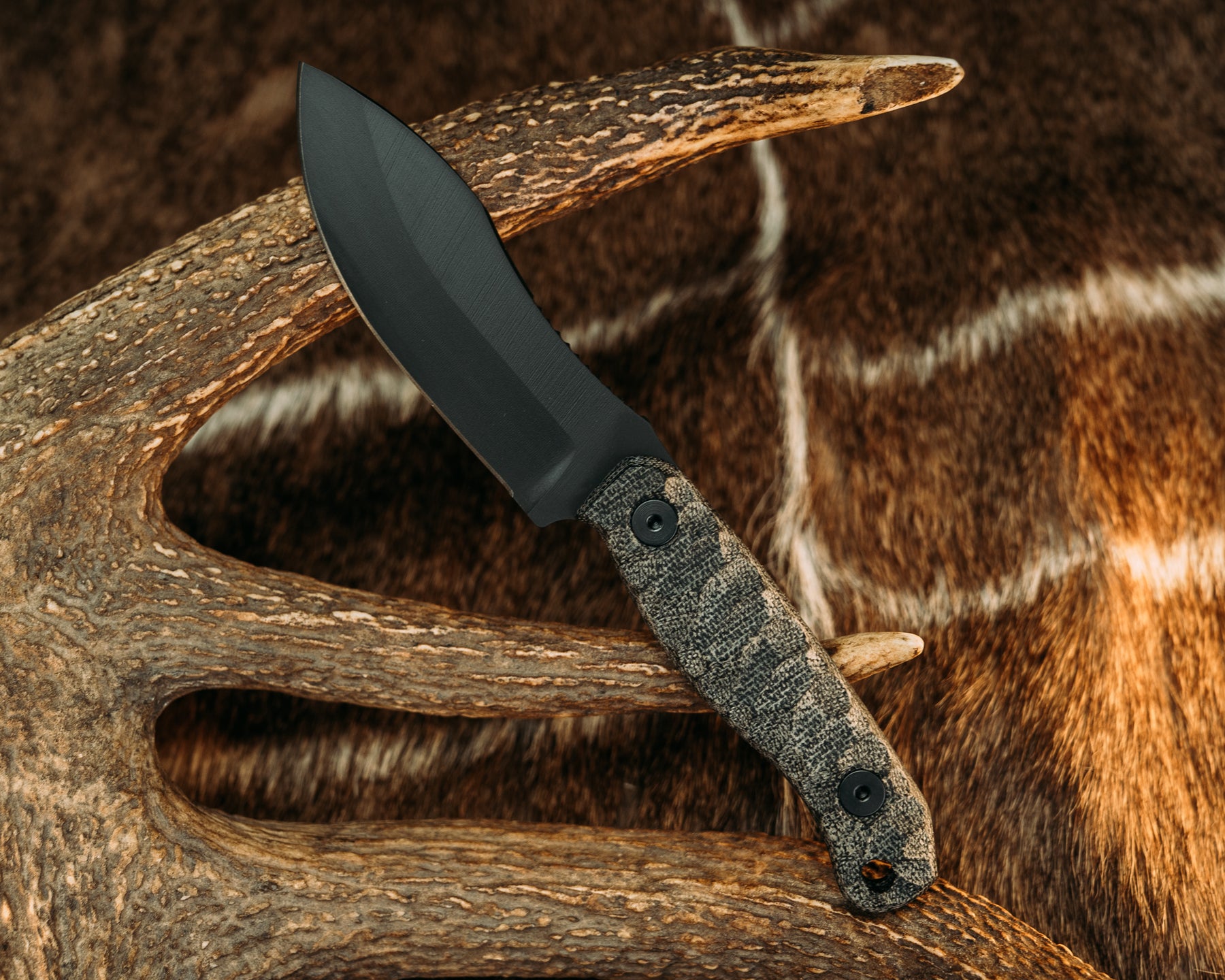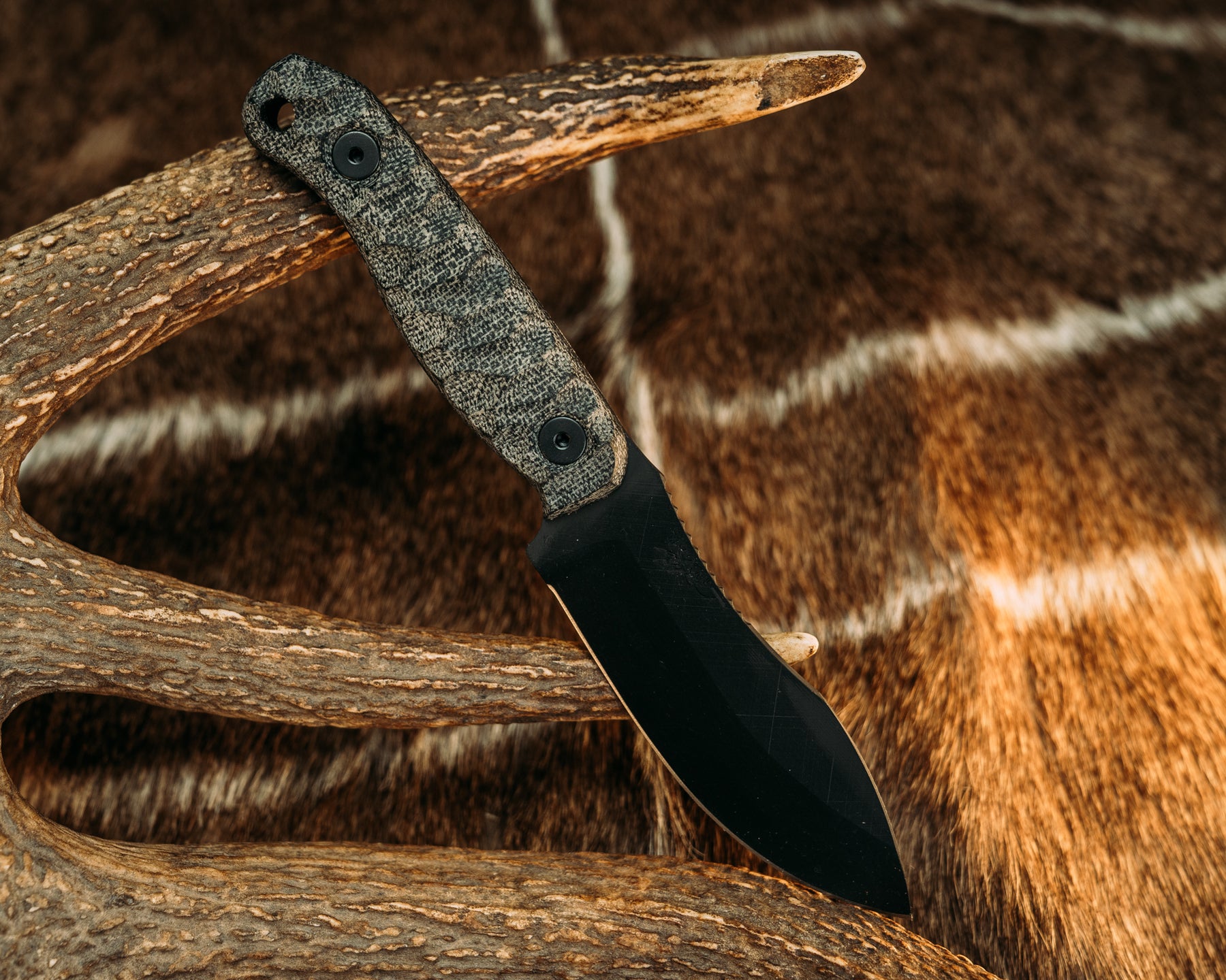 Skinner Jr- Black Canvas Micarta, Armor Black Cerakote, Allen Bolts, Chaos Grip