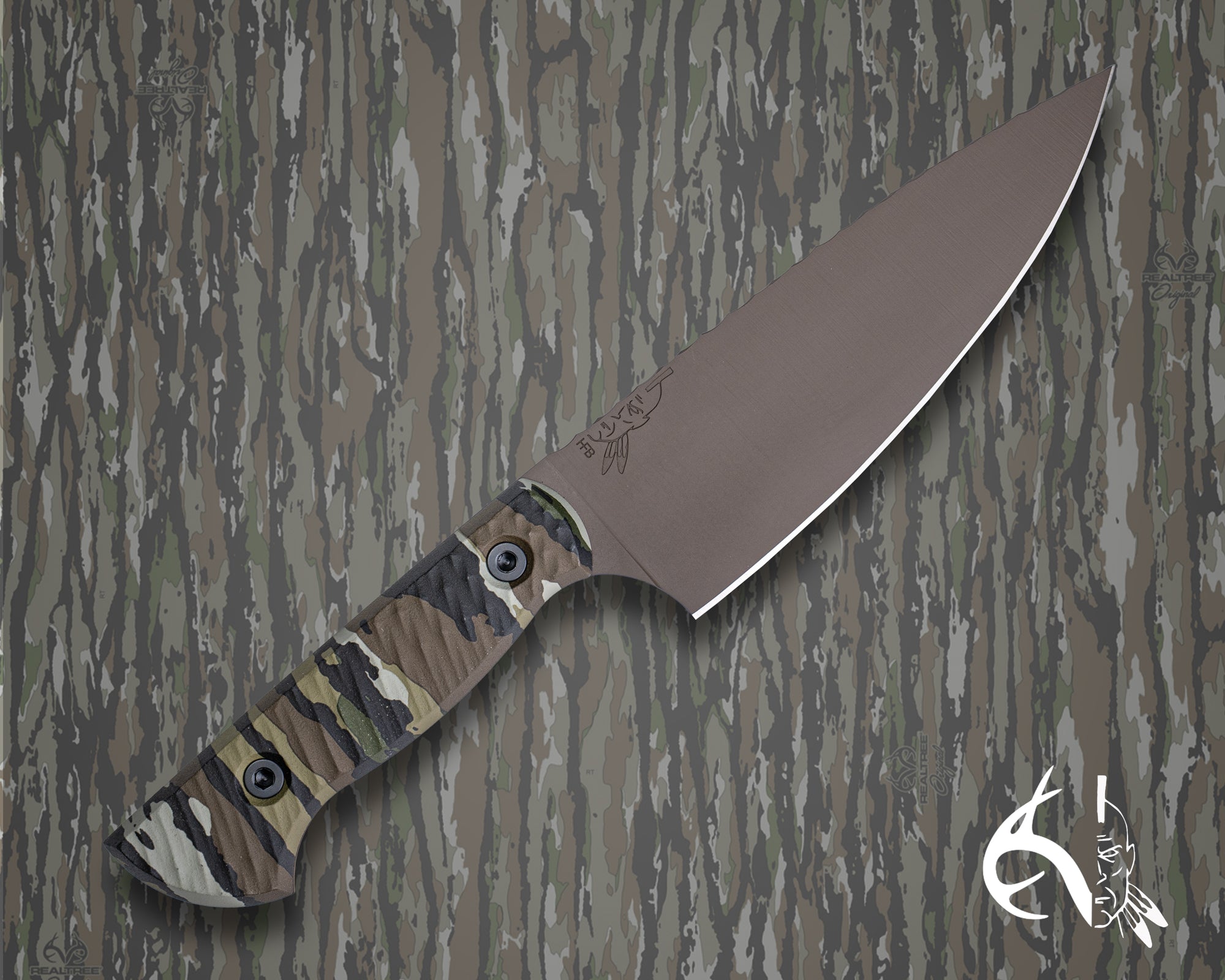 Chef Jr (HFB x Realtree) - Realtree Original Camo Hydro-dipped Micarta, Midnight Bronze Cerakote, Allen Bolts, Textured Grip.