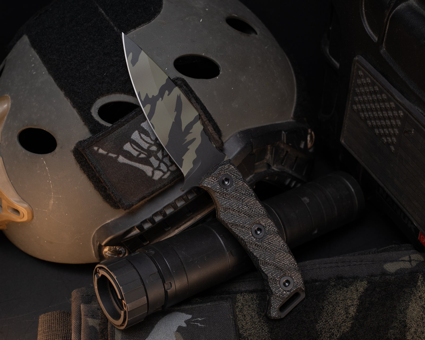 Ishi - Black Canvas Micarta, Tiger Stripe Camo Cerakote, Allen Bolts, Textured Grip