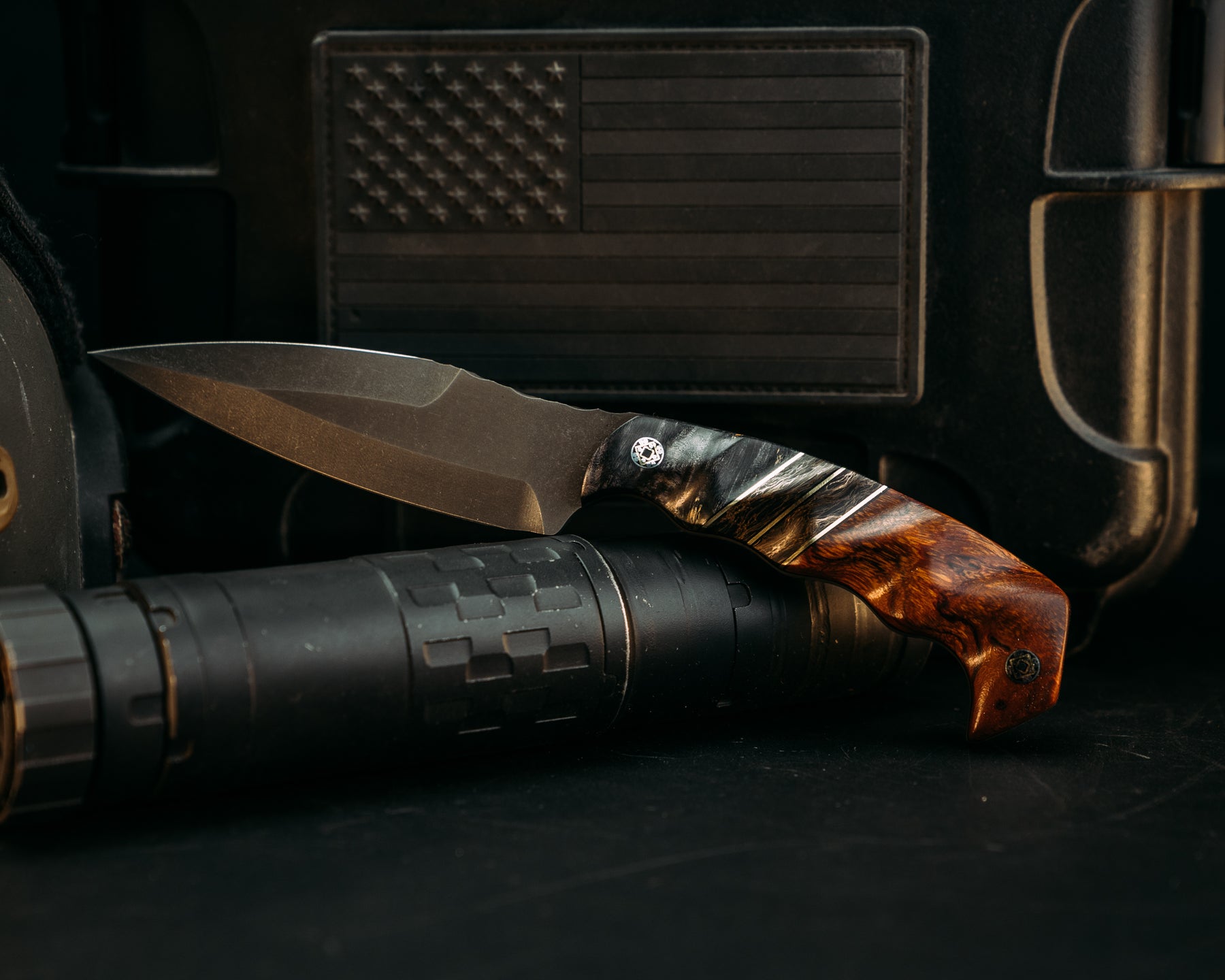 Next: Combat Filet- Black and White Swirl Resin and Burlwood, Patriot Mosaic Pins, Copper Lanyard Pin, Black and White G10 Liner, Textured Grip