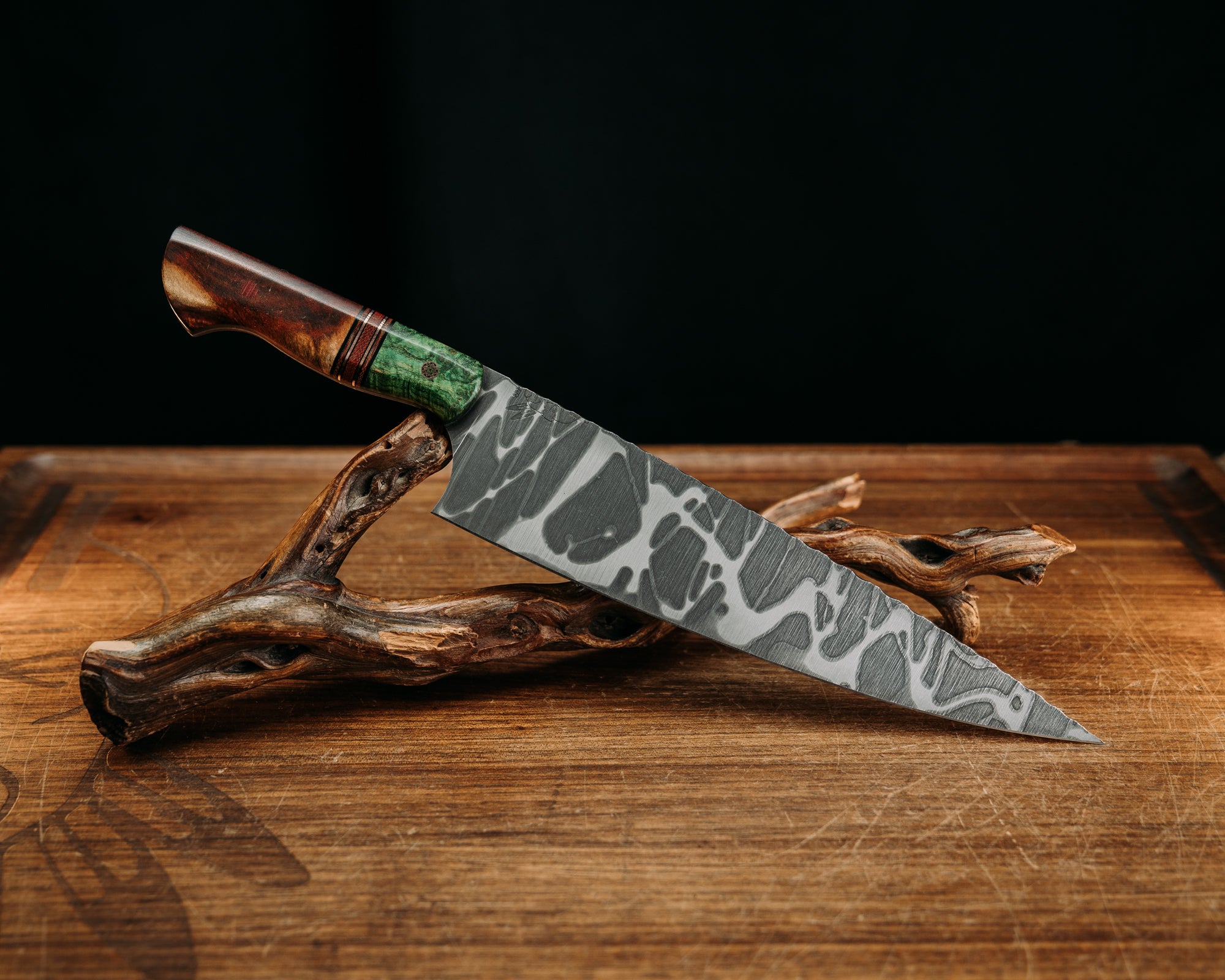 Chef Blade - Ancient Bog Oak, Black & OD Green G10 w/ Brass Pin Striping, Black Canvas Micarta Splits, Desert Ironwood, Mosaic Pins, Smooth Grip.