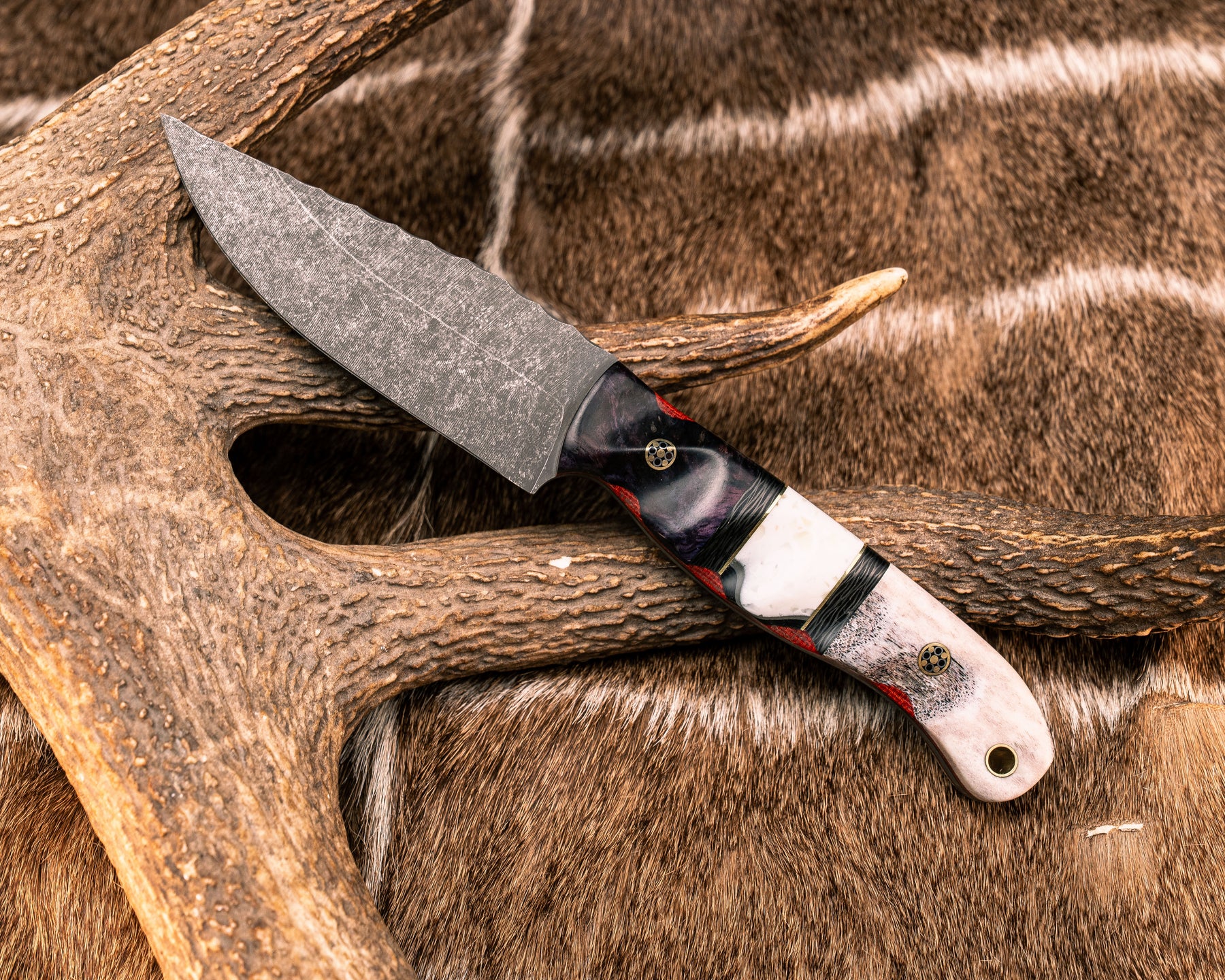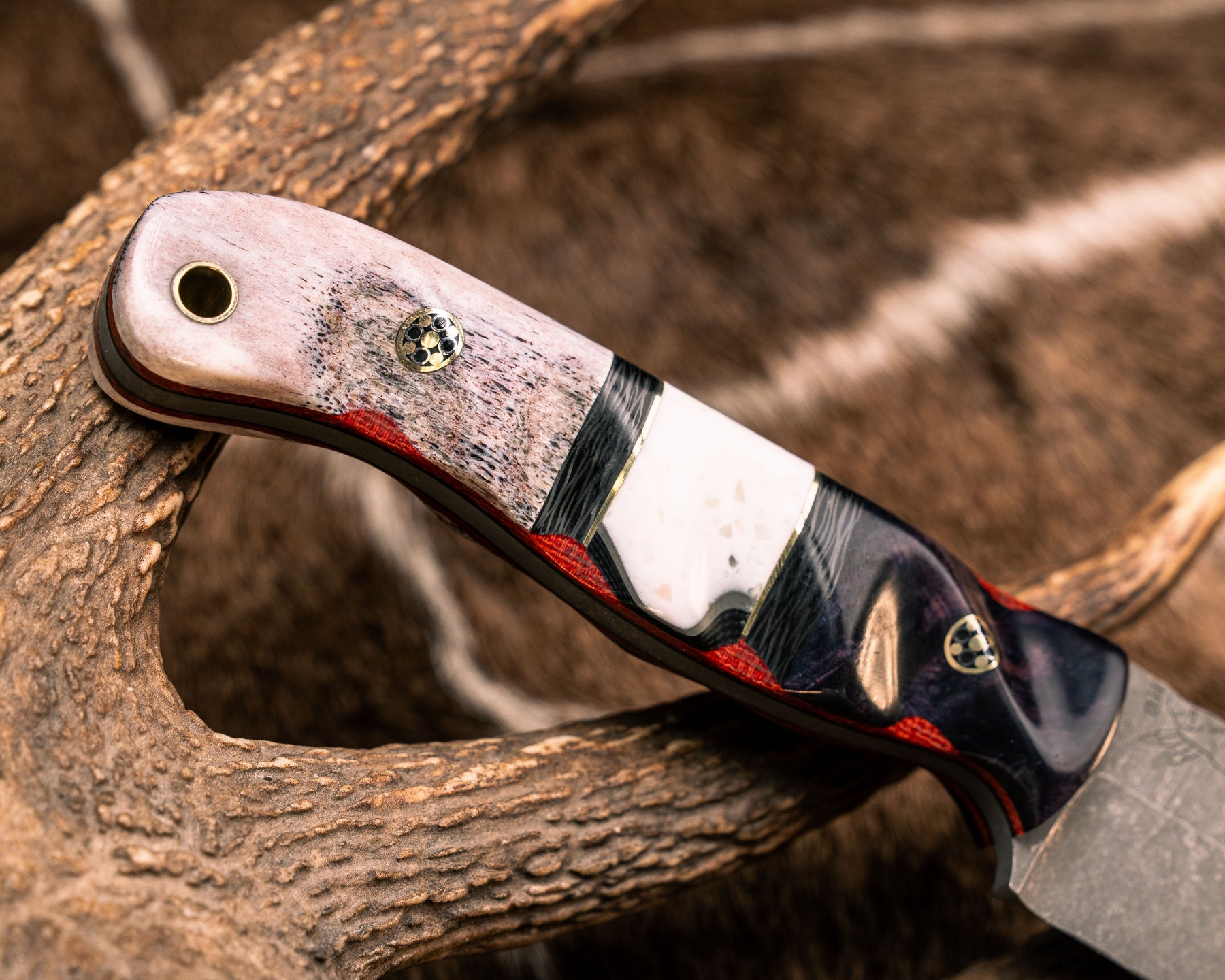 Crow Jr- Dyed Maple, Carbon, Brass and White Resin Split, CO Elk Antler Over Fire Canvas Micarta and Black G10, Mosaic Pins, Brass Lanyard Pin, Textured Grip