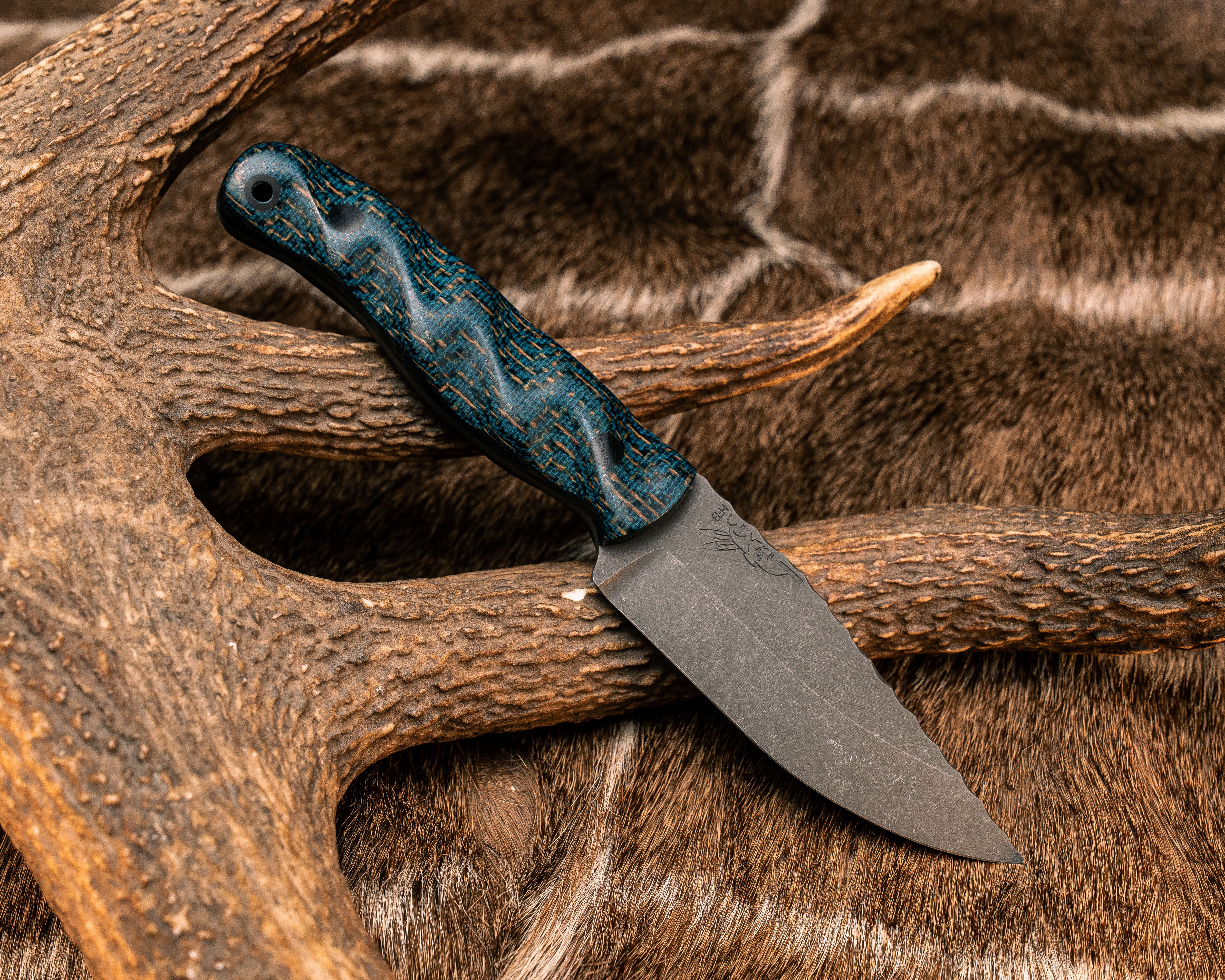 Crow Scout- 80's Rad Carbon, Black G10 and White G10 Pin Striping, Blue Dark Matter Carbon Split, 1/8" CF Pins, Textured Grip