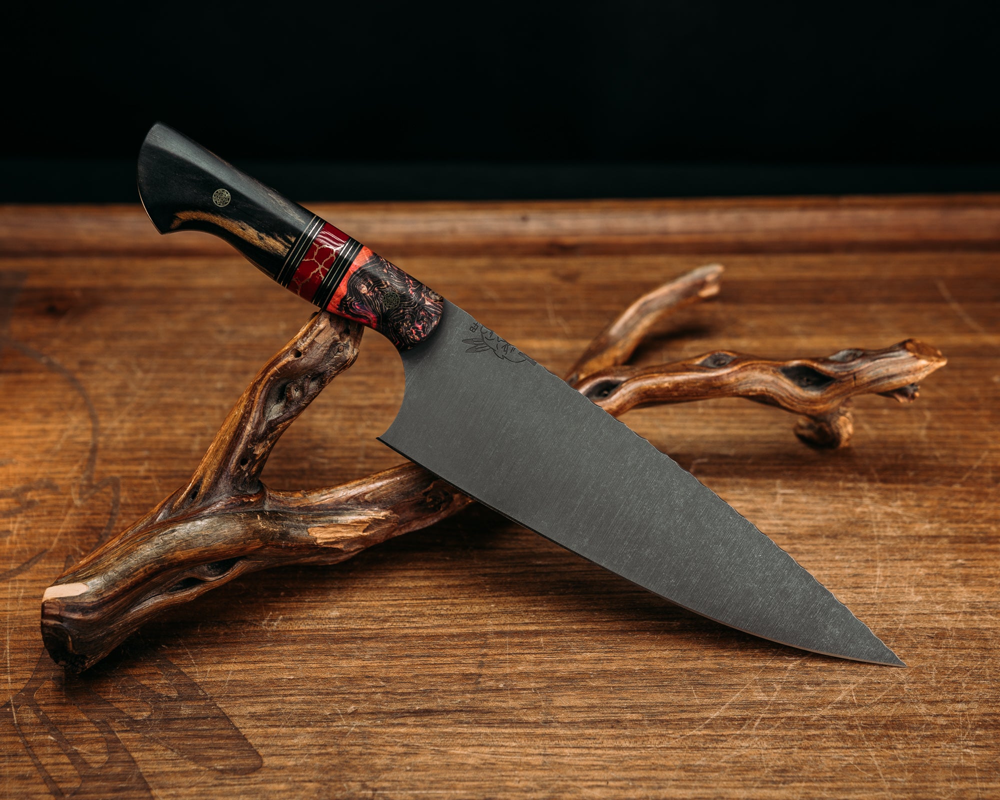 Next: Chef Blade- Dyed Maple, Black G10, Coyote G10, Black Micarta, Ruby G10 and Brass Pin Striping, Red with Gold Web Tru-stone Split, Black and White Ebony, Mosaic Pins, Smooth Grip