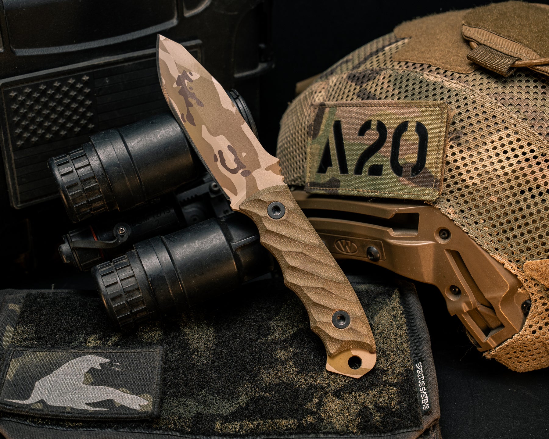 Next: Disaster Jr- Natural Canvas Micarta, Arid Multicam Cerakote, Allen Bolts, Textured Grip