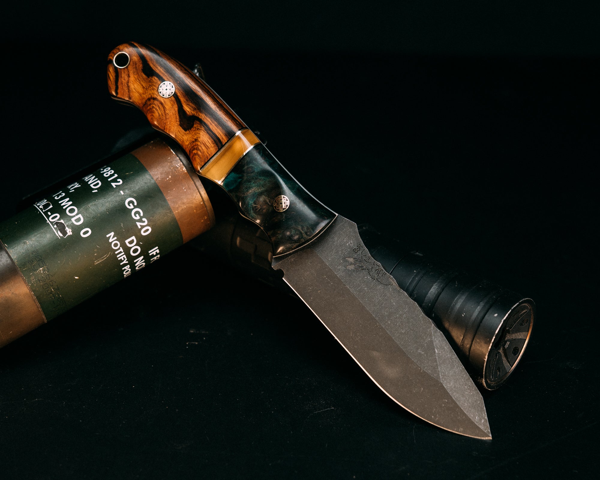 Field Knife (CruWear) - Asian Gempol, Brass & Fire Canvas Micarta w/ Ivory G10 Pin Striping, Dark Matter Gold Marbled Carbon Fiber Split, Mosaic Pins, Smooth Grip.