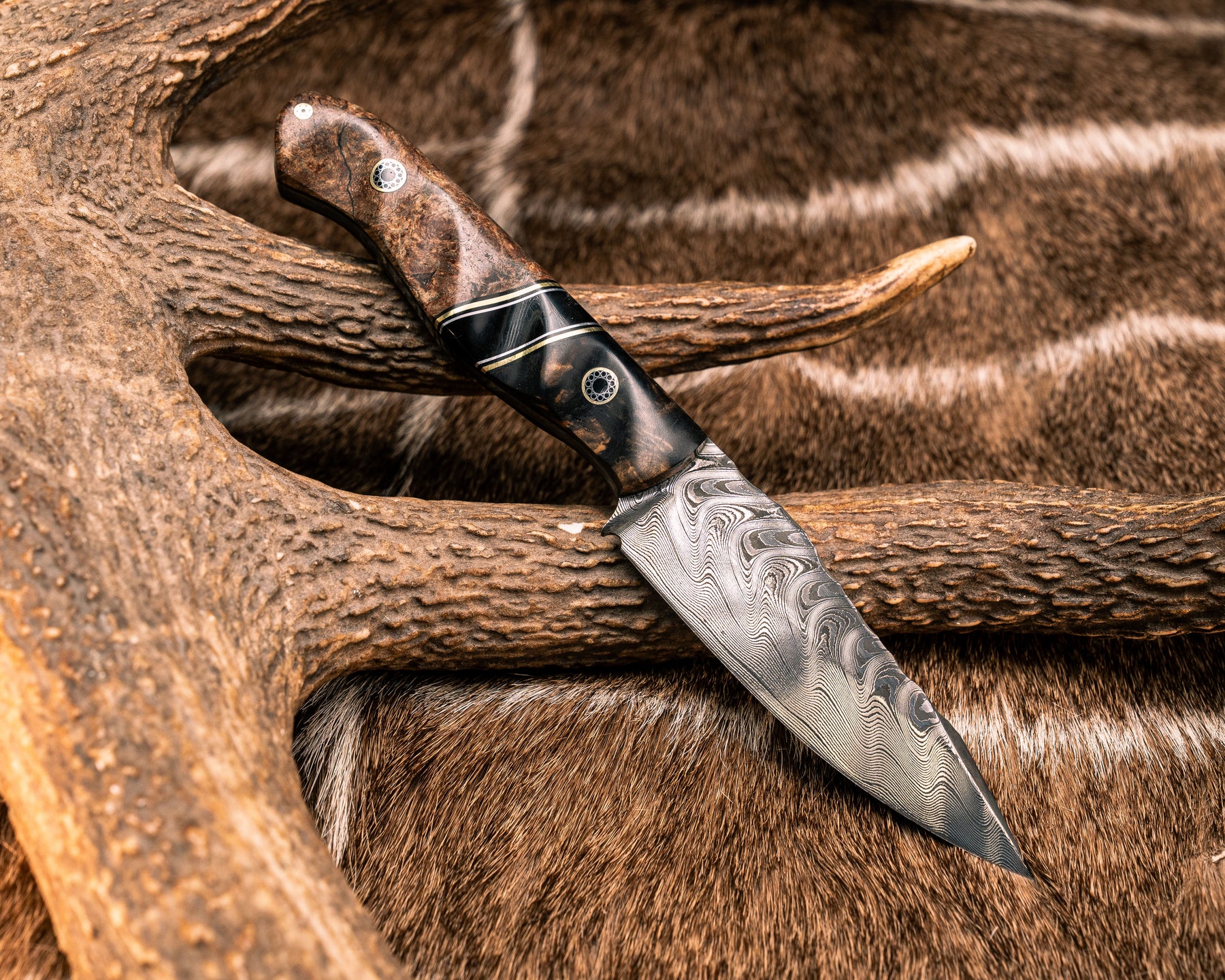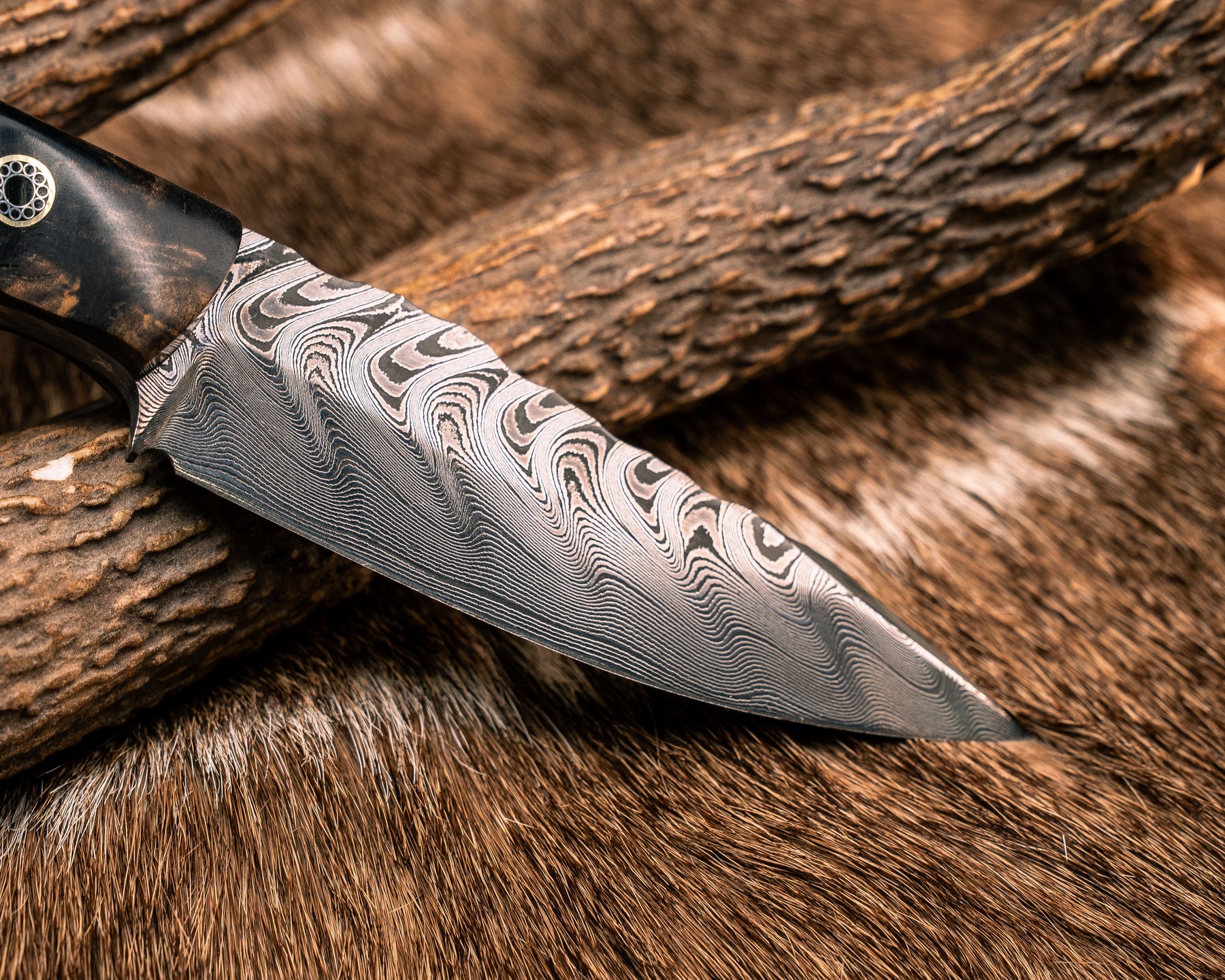 Field Knife Jr- Baker Forge Ripple Damascus, Black And White Ebony, Brass, Black G10 and Aluminum Pin Striping, Bison Horn Split, Chechen, Mosaic Pins, Textured Grip