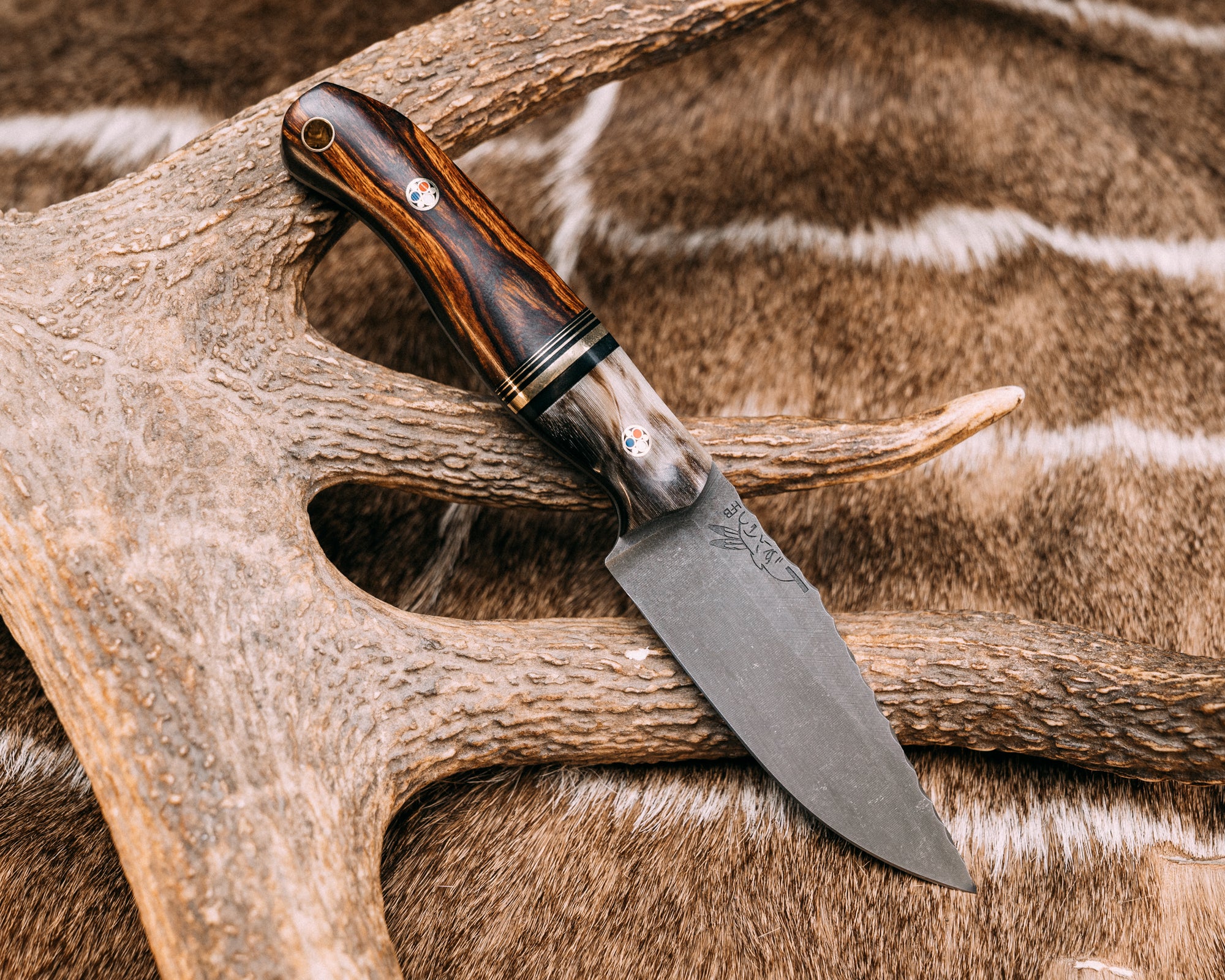 Next: Crow Scalper- Rams Horn, Black G10 and Brass Split, Desert Ironwood, Patriot Mosaic Pins, Brass Lanyard Pin, Contoured Grip