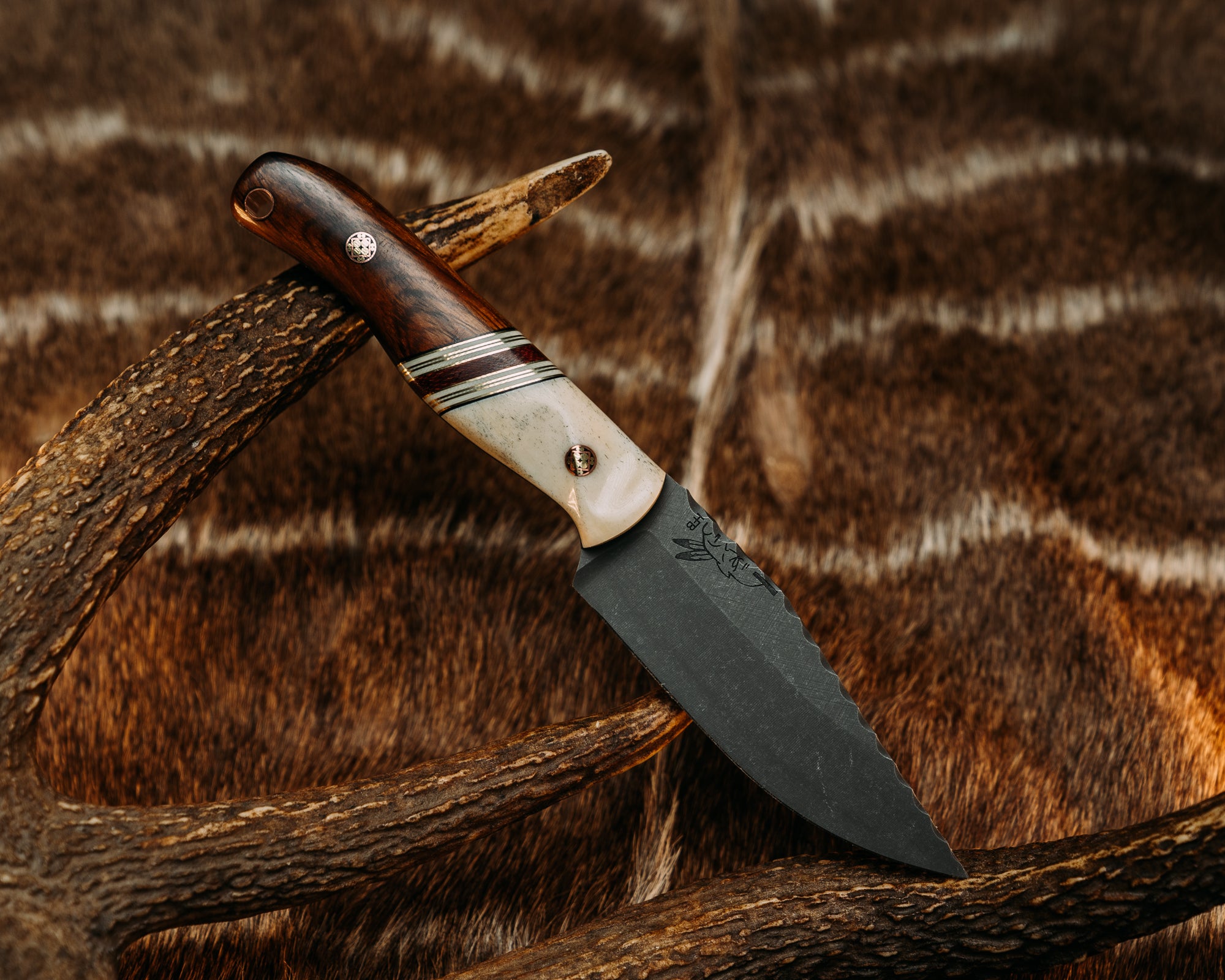 Next: Crow Scalper - Giraffe Bone, Black & Ivory G10 w/ Brass Pin Striping, Fire Canvas Micarta Split, Desert Ironwood, Mosaic Pins, Copper Lanayrd Pin, Contoured Grip.