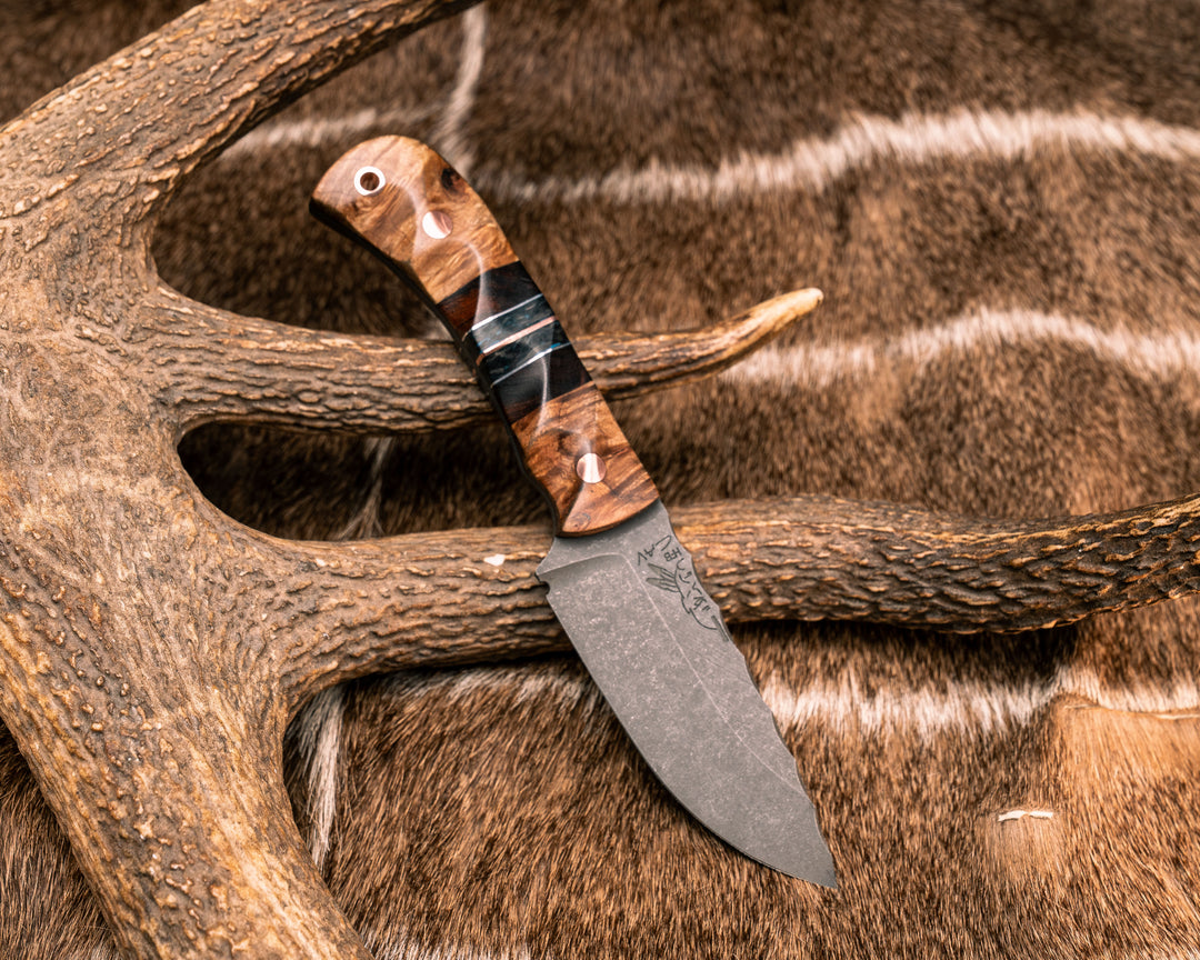 Field Knife- Amboyna Burl, Black G10, Admiral Blue Jute Micarta and Black Canvas Micarta Split, CO Elk Antler, Mosaic Pins, 1/8" Aluminum Pin, Textured Grip
