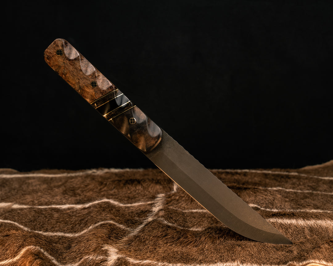Aikuchi- Black Walnut, Black G10 and Brass Pin Striping, Gold Dark Matter Carbon and Bison Horn Split, Black Forest Mango, Mosaic Pins, Textured Grip