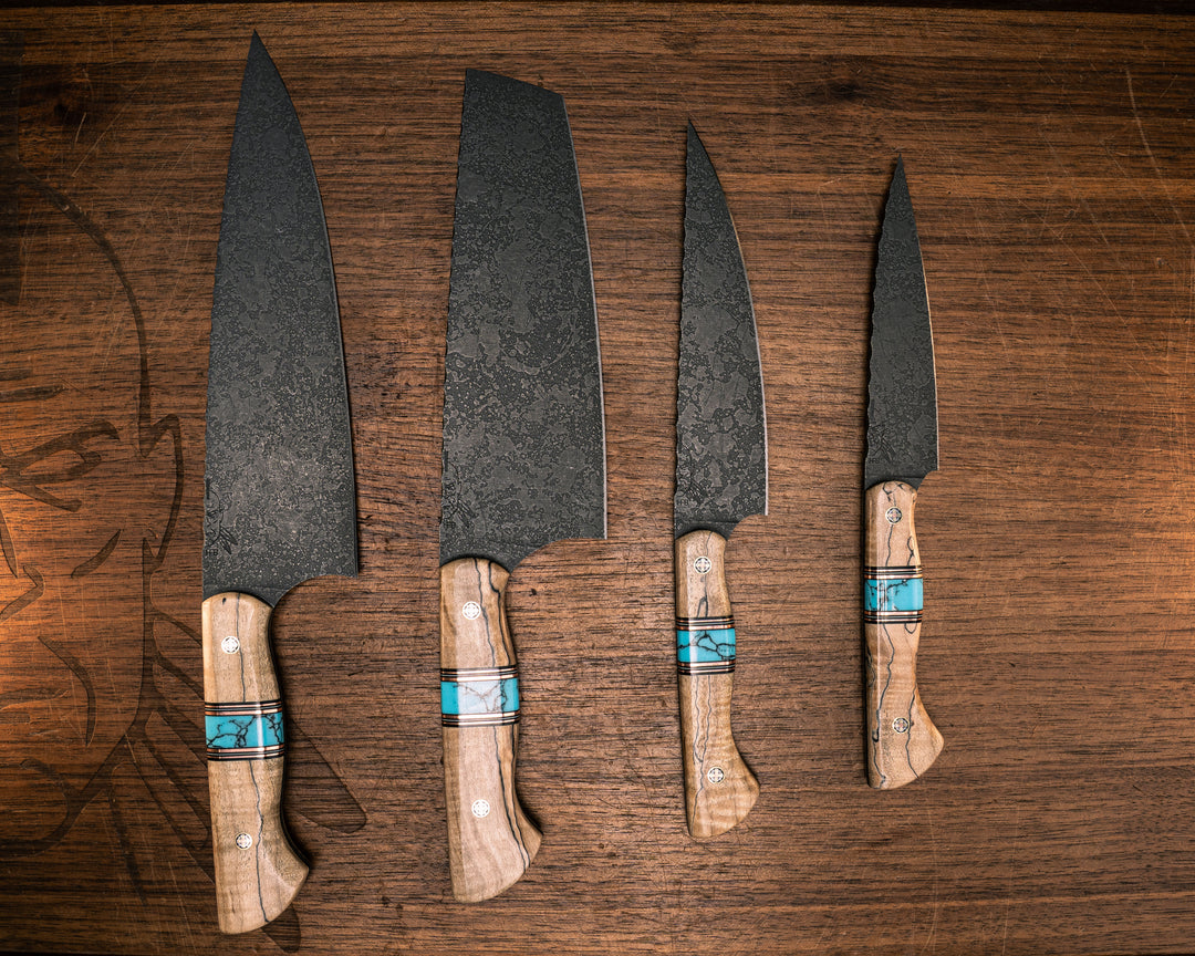 Chef Set- Spalted Maple, Black G10, Copper qand White G10 Pin Striping, Turquoise with Black Matrix Tru-stone Split, Mosaic Pins, Smooth Grip