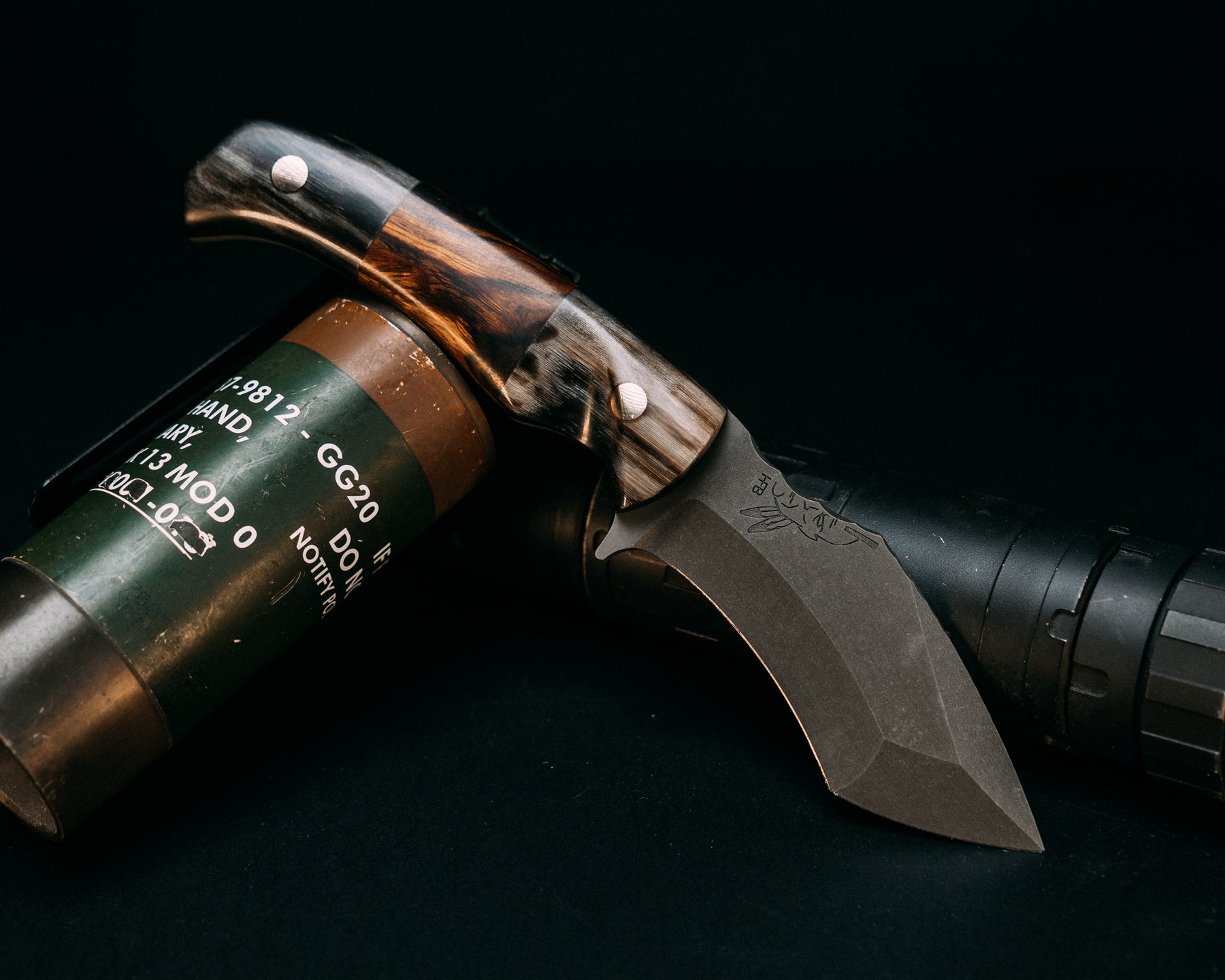 Buteo- Rams Horn, Desert Ironwood Split, Brass Pins, Contoured Grip