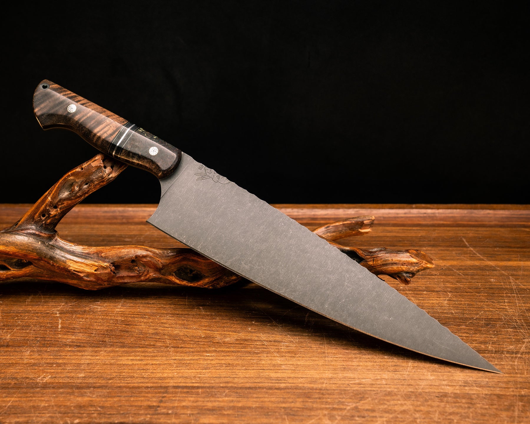 Chef Blade 10"- Dyed Black Ash, Black G10, Brass, and Aluminum Split, Hawaiian Curly Koa, Mosaic Pins, CF Lanyard Pin, Smooth Grip